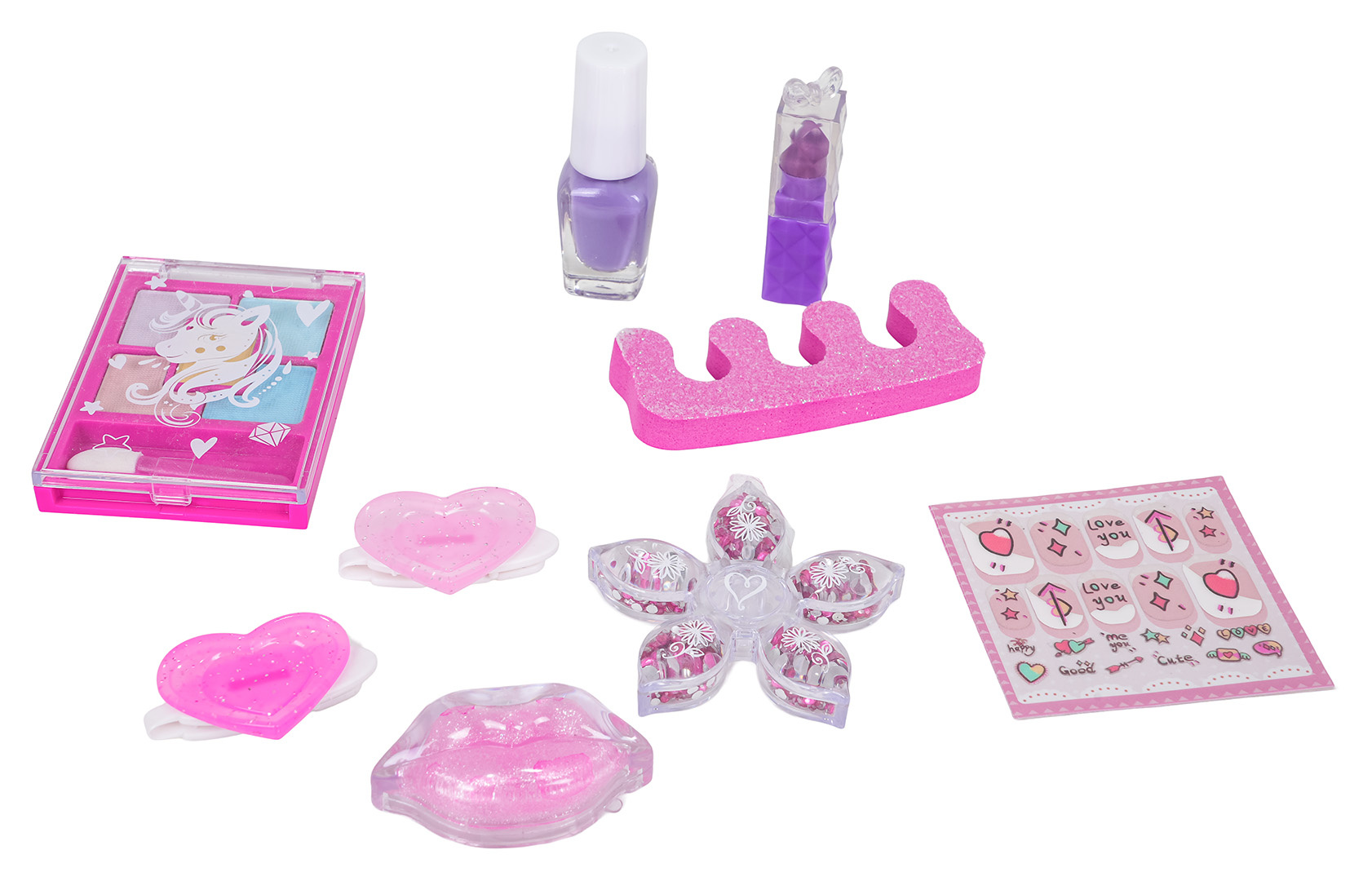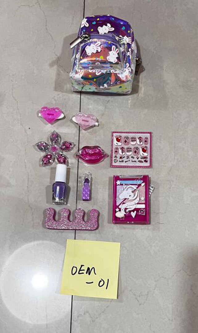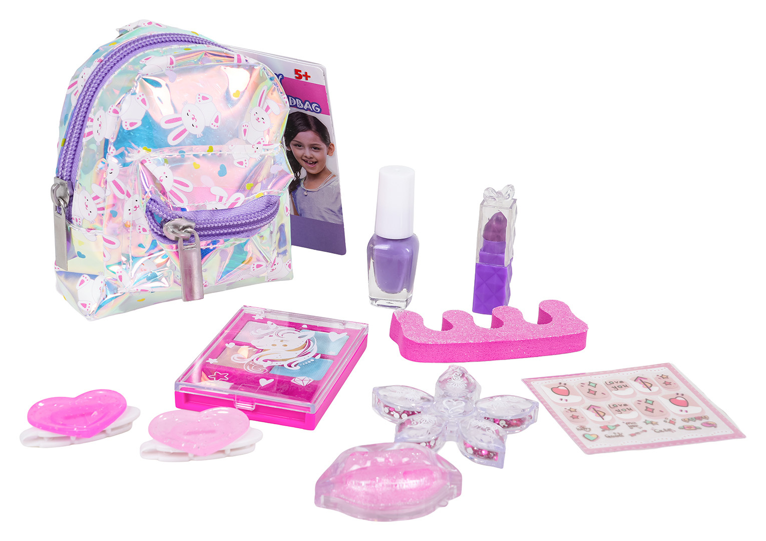 Sada kosmetiky s batůžkem pro malou módní znalkyni od pěti let. V sadě kromě batůžku najdete 2 sponky, lak na nehty, rtěnku, aplikace na nehty, nálepky na nehty, separátor na prsty, lesk na rty a oční stíny. Sada je vyrobena z nejkvalitnějších materiálů bezpečných pro dítě.