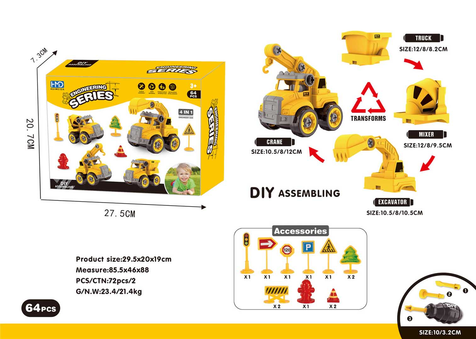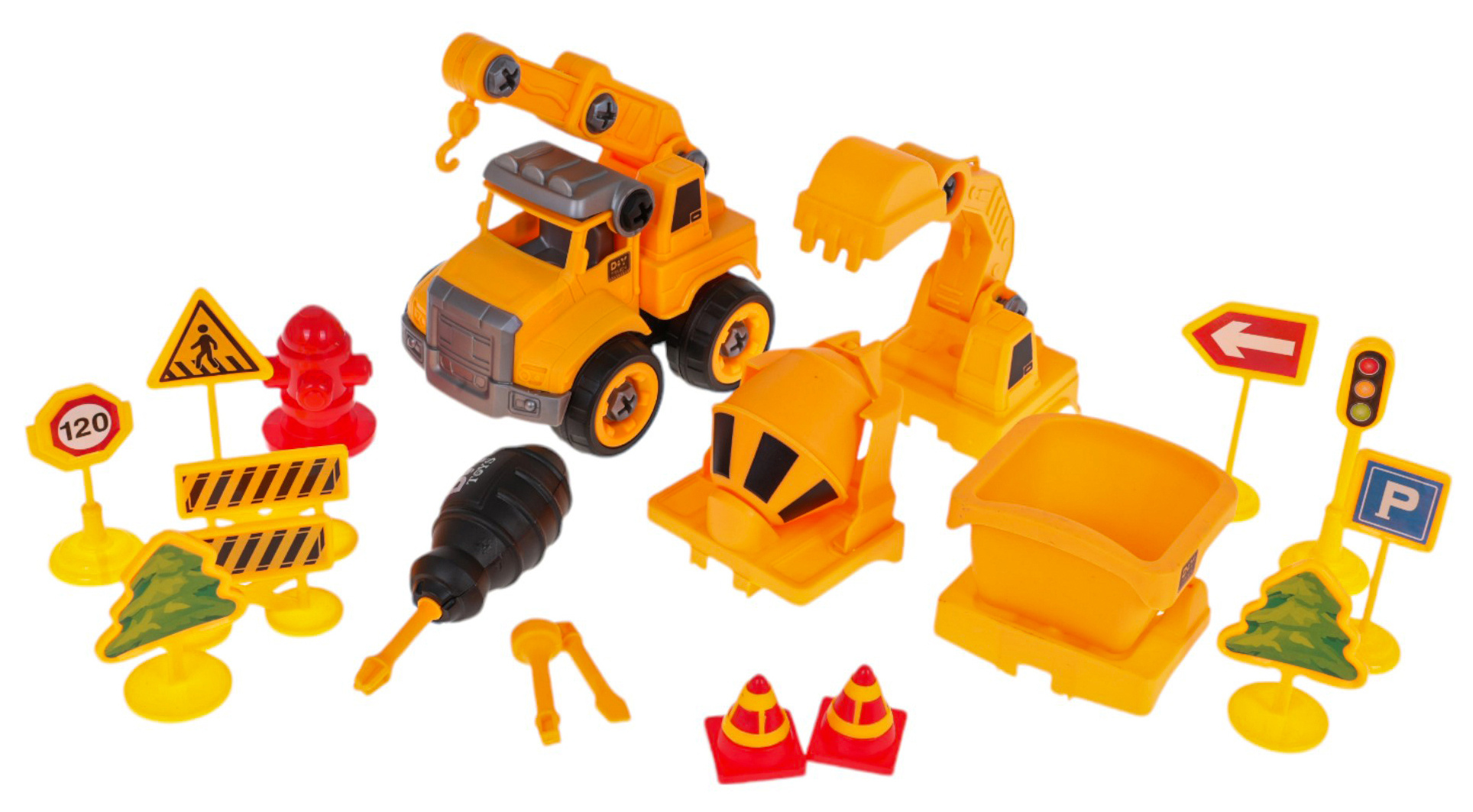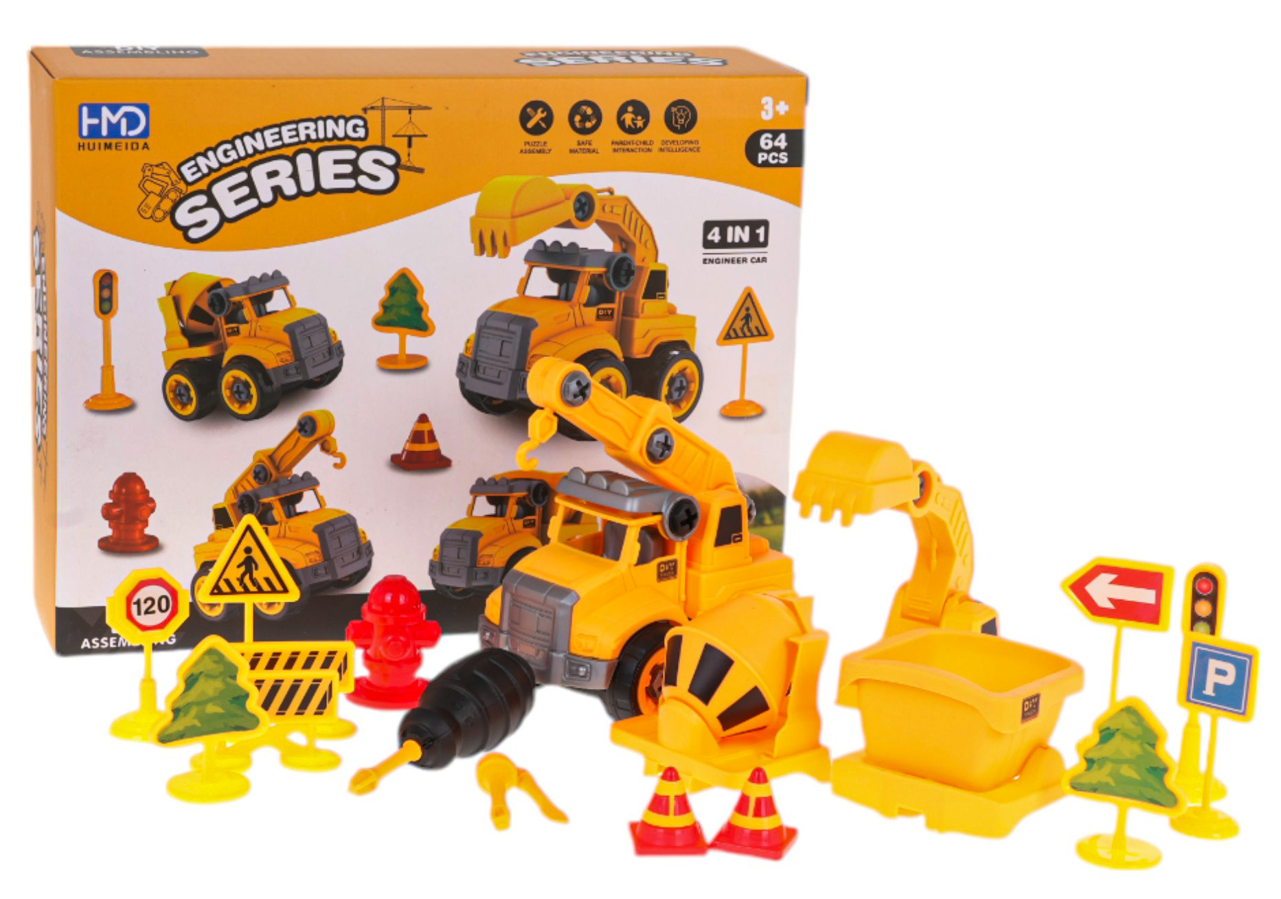 Stavební vozidlo 4 v 1 s příslušenstvím pro děti od 3 let. Sada byla vyrobena z nejkvalitnějšího plastu. Díky vyměnitelným prvkům můžeme stavební autíčko přeměnit nebo rozložit na jednotlivé části. V sadě se nachází šroubovák s vyměnitelnými nástavci.