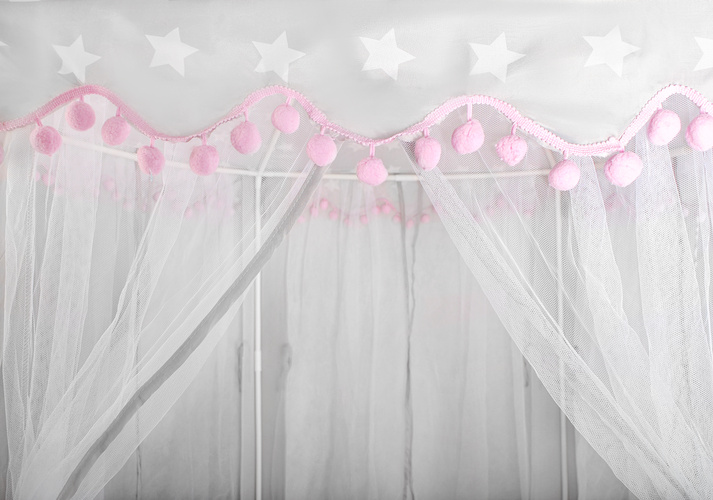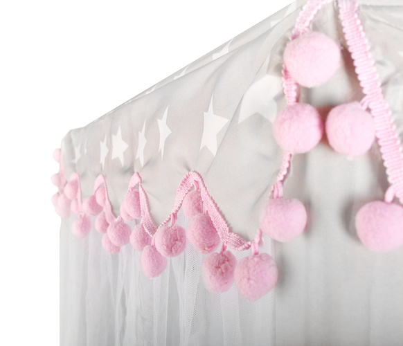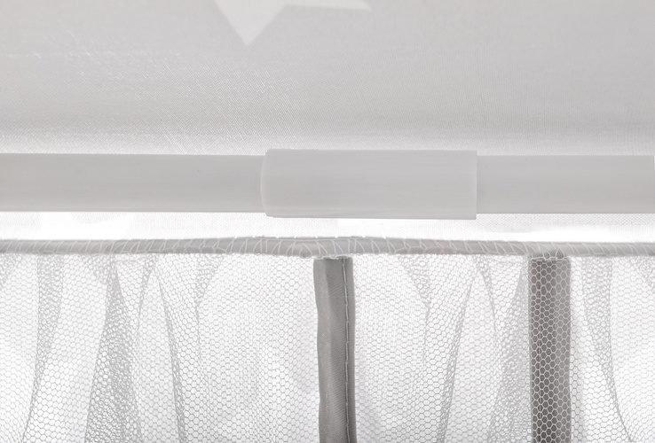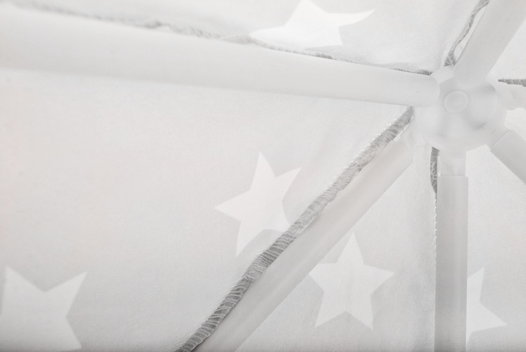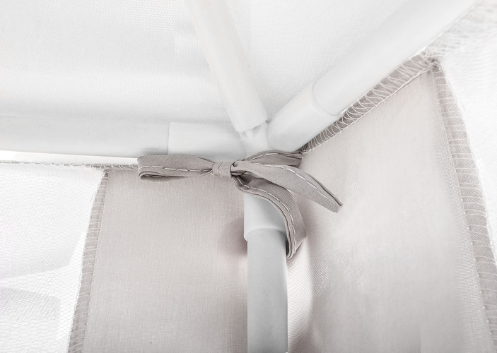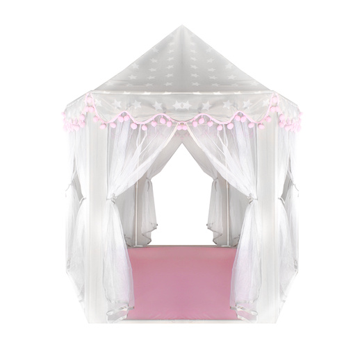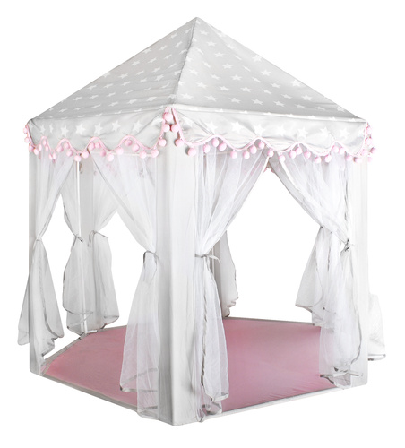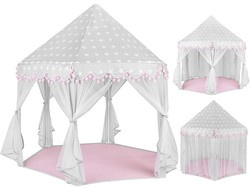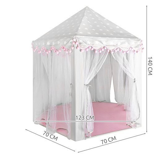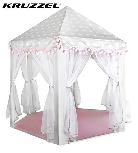 Materiálový zip je rozhodně nenahraditelným společníkem při dětských dovádění. Má šestihrannou základnu, 6 vstupních otvorů a kónické hledí. Vchody jsou zakryté průsvitnými bílými závěsy, které dokonale splývají se zbytkem stanu . Gardinky lze zavázat nebo přehodit různými způsoby s ozdobnými stuhami Řešení používané s luky dodává kouzlo a zpestřuje zábavu.