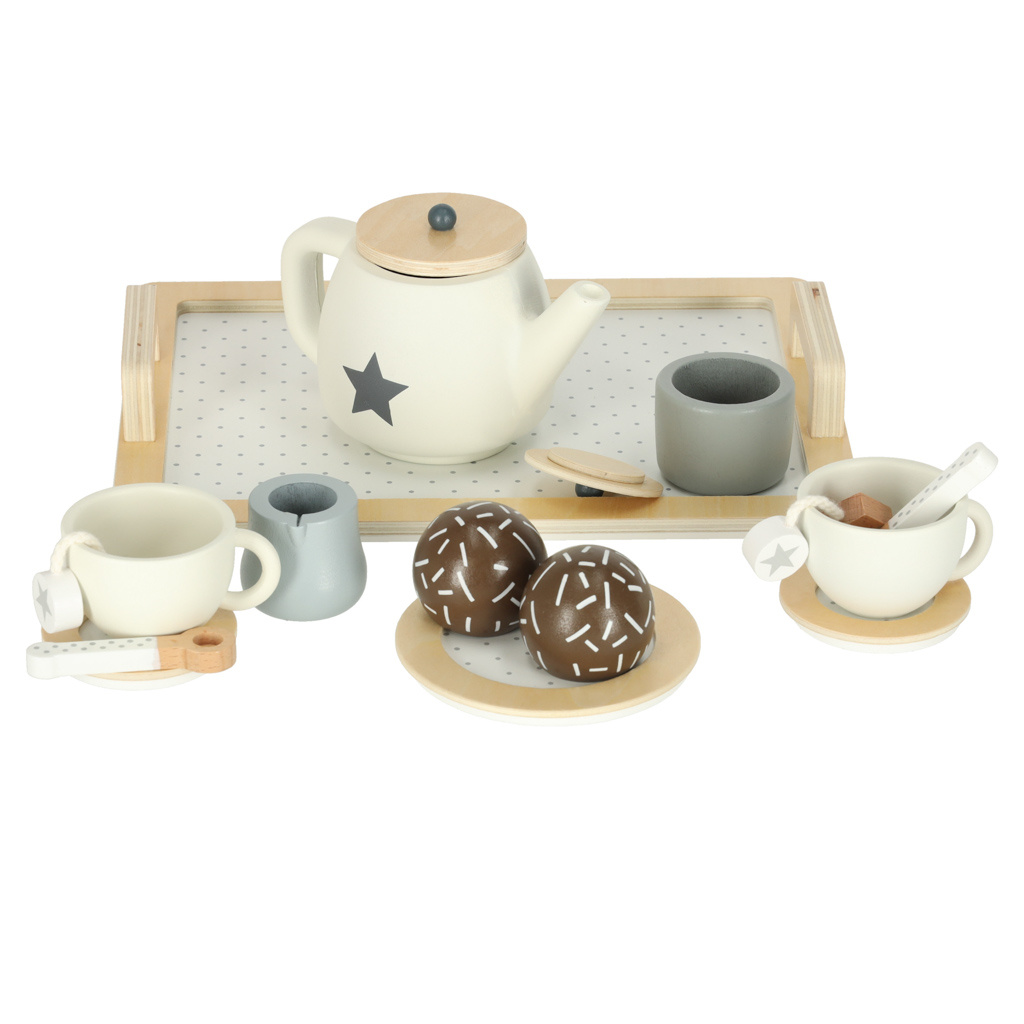 Senzační čajová souprava je praktickým doplňkem každé domácnosti. Po splnění svých povinnosti si můžeš posedět s kamarádkami nebo se svou panenkou u šálku dobrého čaje a popovídat si, co každá dnes zažila. Souprava je vyrobena ze dřeva a skutečně imituje skutečnou čajovou soupravu.