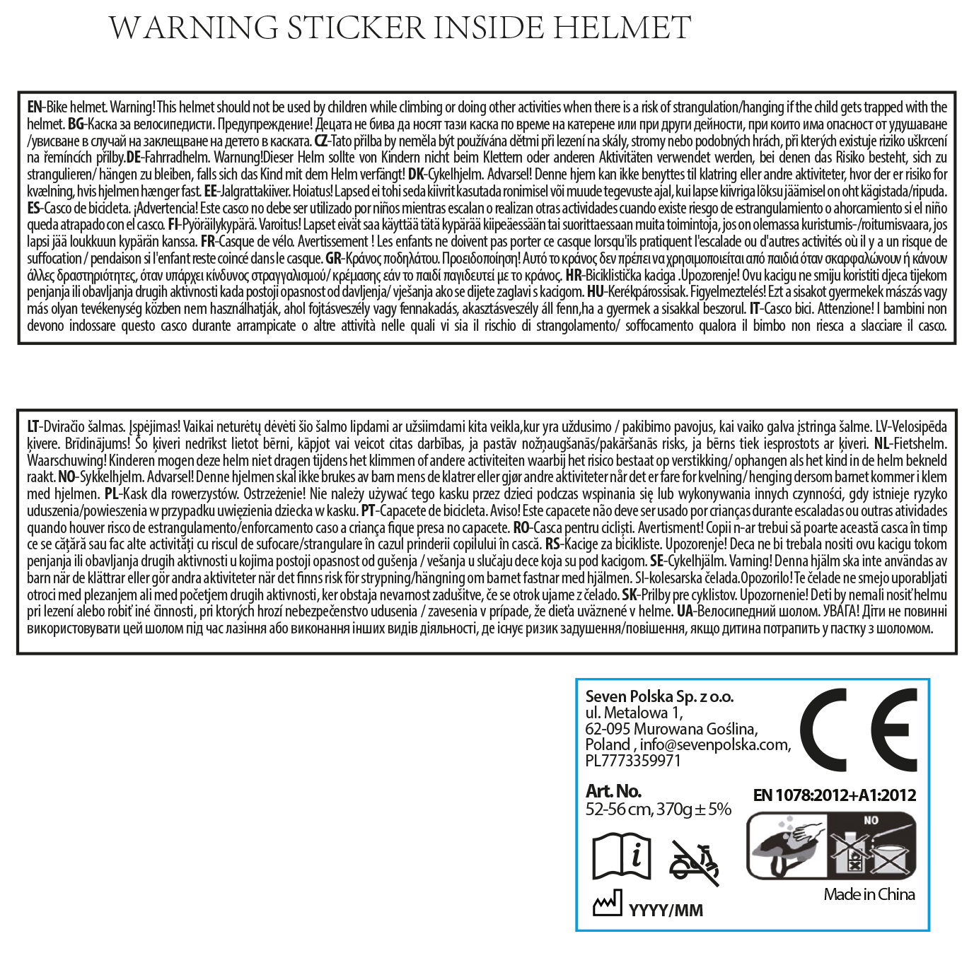 Varování! Tato helma by neměla být používána dětmi při lezení nebo jiných aktivitách, kde hrozí riziko uškrcení/oběšení, pokud se dítě s helmou zachytí.