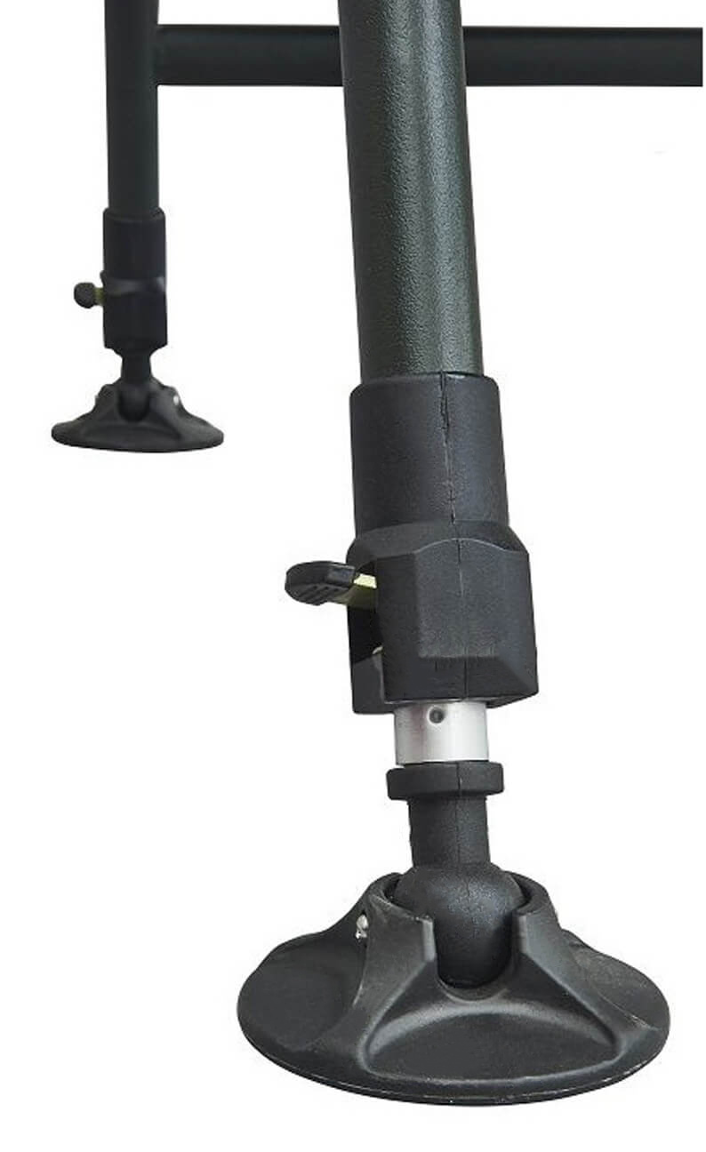 Nastavitelné nohy s širokými patkami proti zapadání zabezpečují pohodlnou možnost umístění v nerovném terénu.