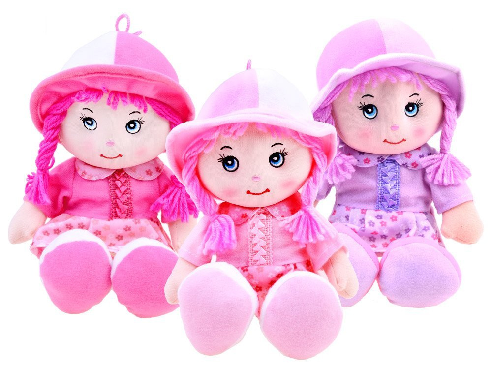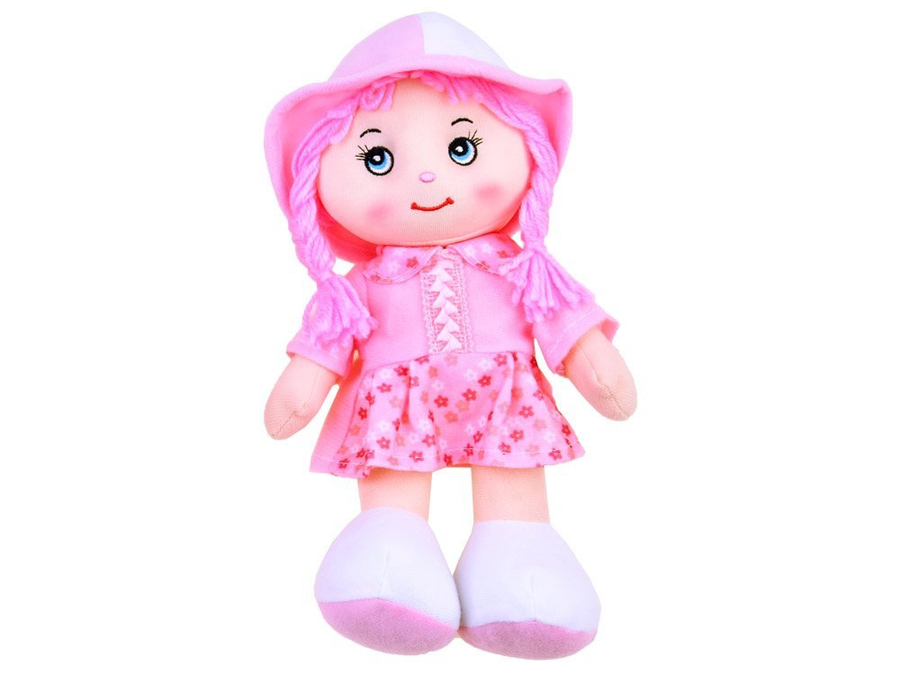 Panenka je měkká s copánky, má na sobě roztomilý klobouček a šatičky.