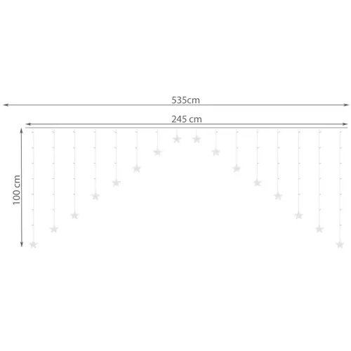SPECIFIKACE - počet režimů: 8; typ osvětlení; VEDENÝ; barva světla: teplá bílá; barva vedení: transparentní; počet LED: 136; třída vodotěsnosti: IP44; dálkové ovládání: ano; napájení: elektrická síť; výkon: 1,2W; rozměry jedné hvězdy: 9 cm; celková délka: 535 cm; délka rampouchu: 100 cm; hmotnost: 0,388 kg; hmotnost v balení: 0,494 kg.