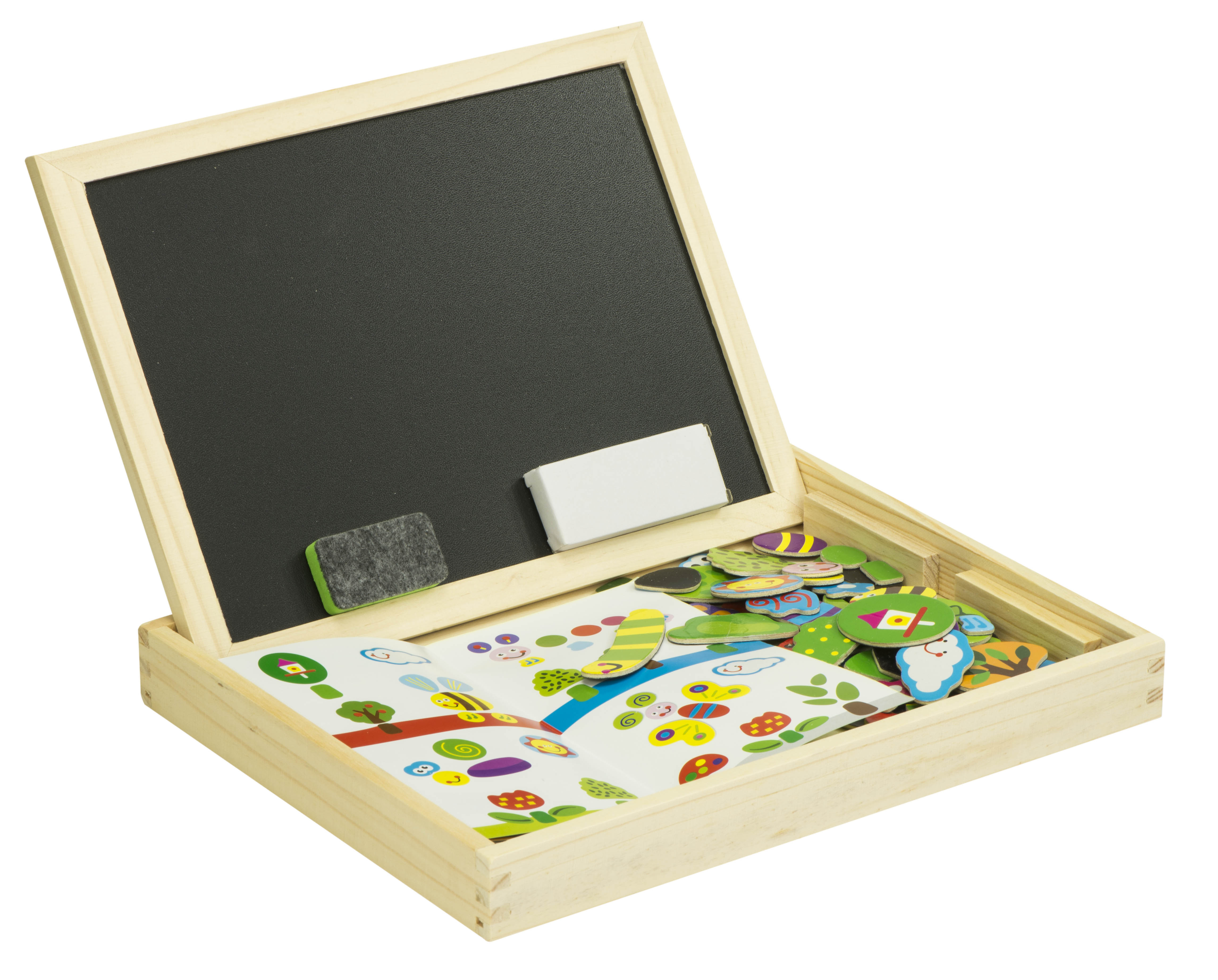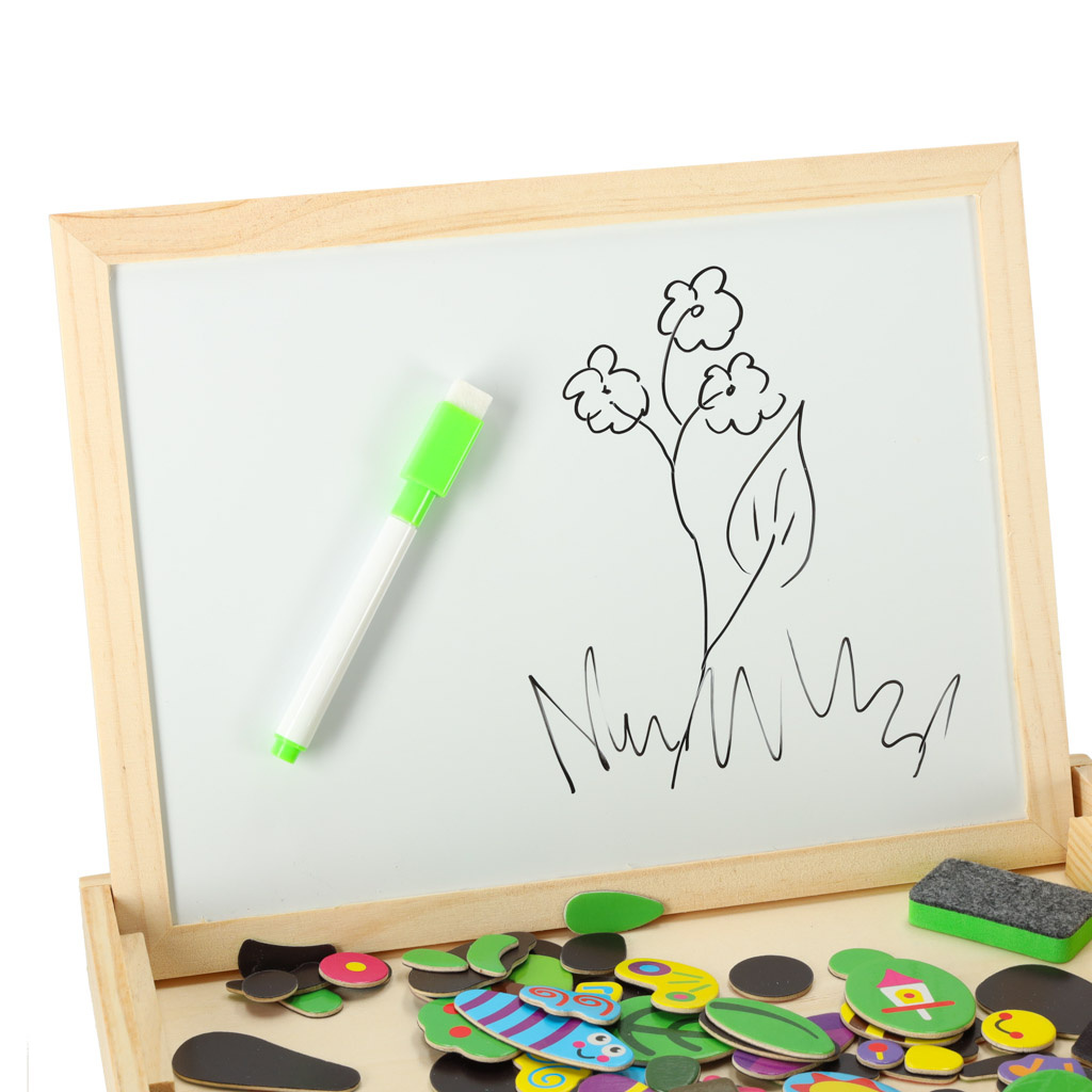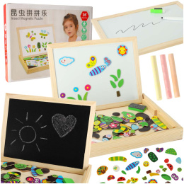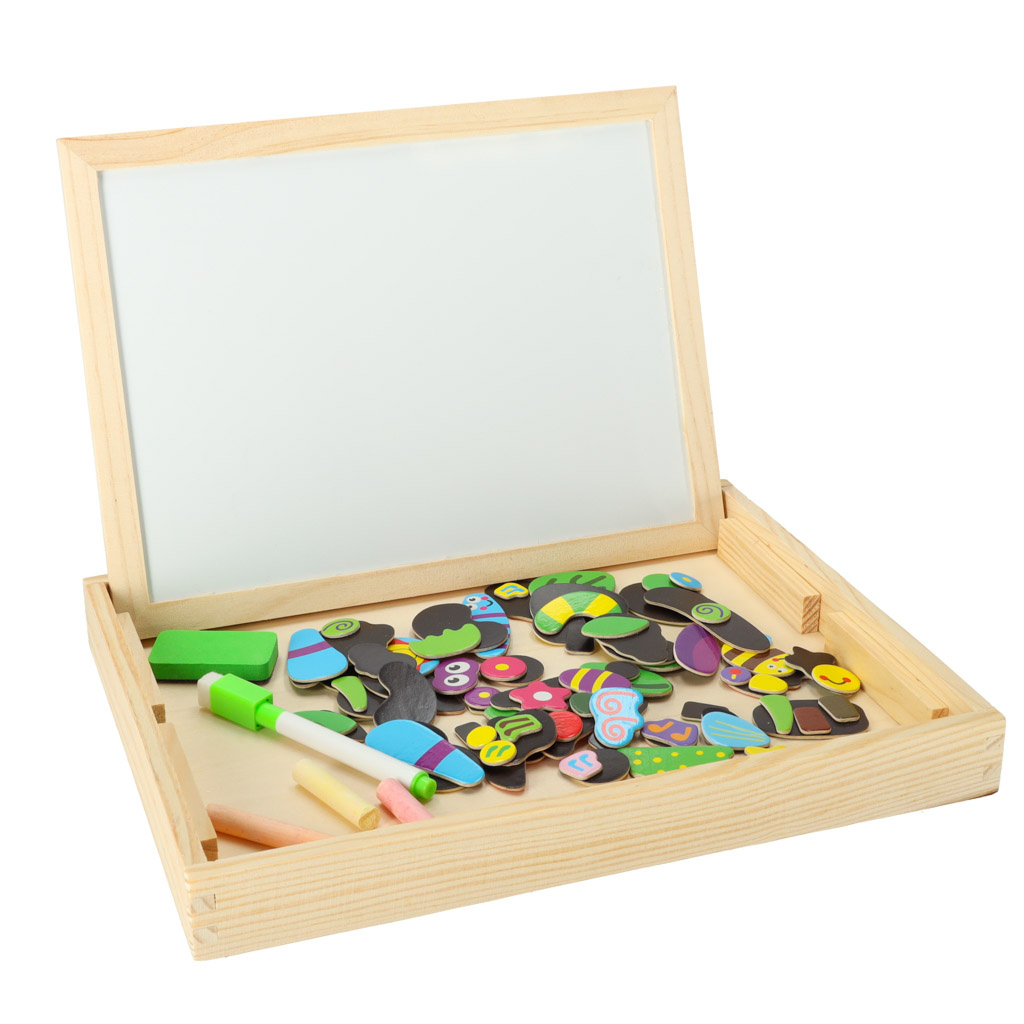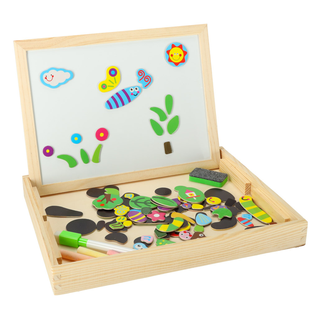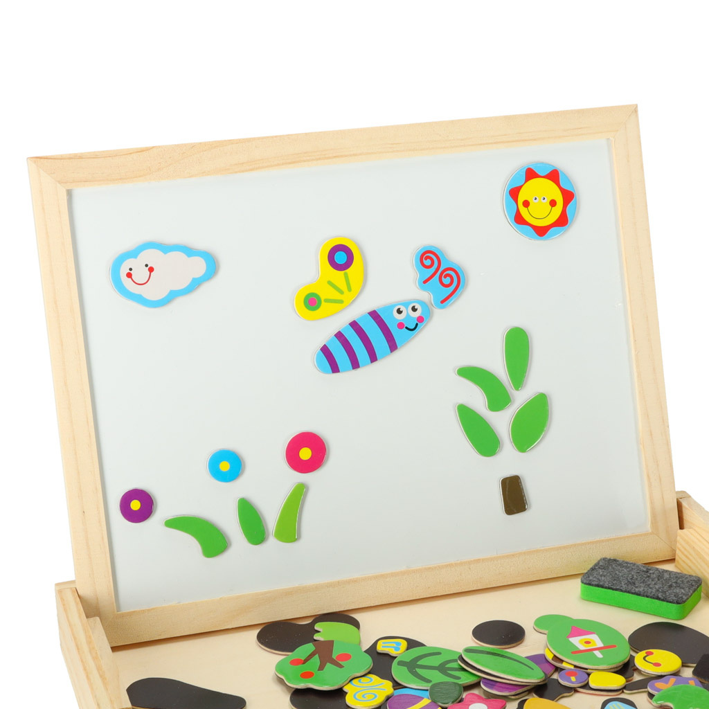 Oboustranná dřevěná deska s magnetickými skládačkami na uspořádání obrázků.