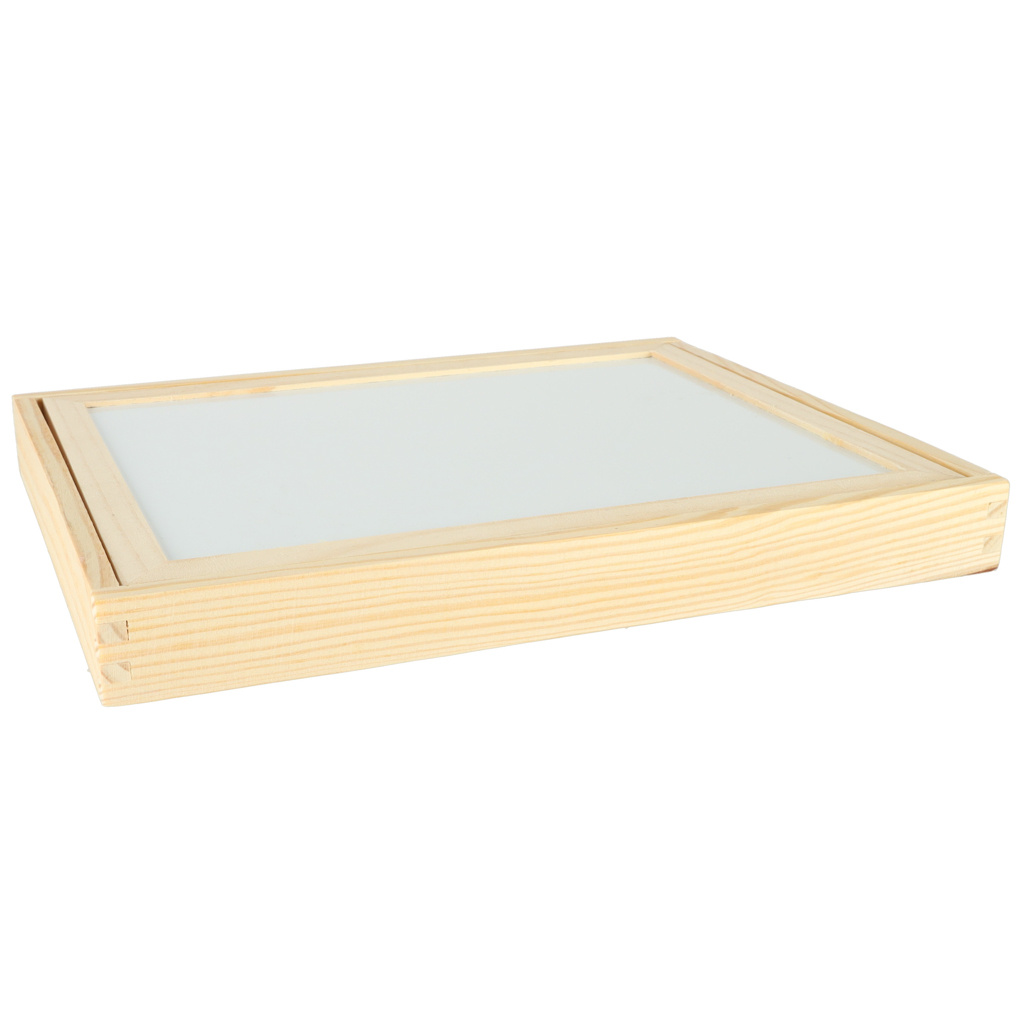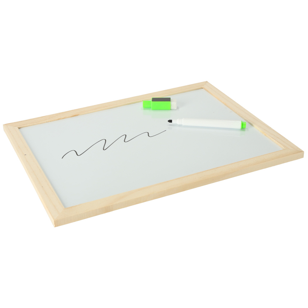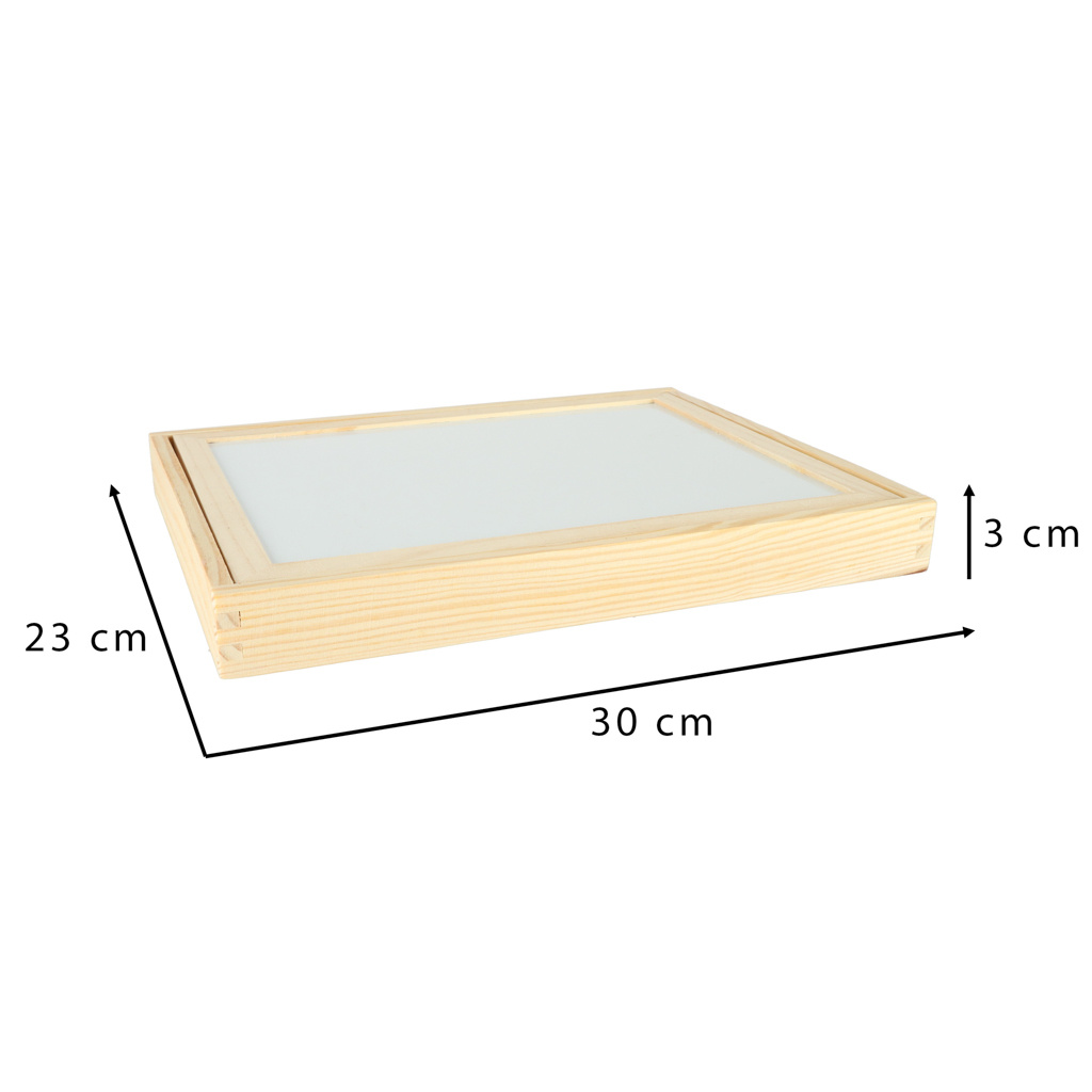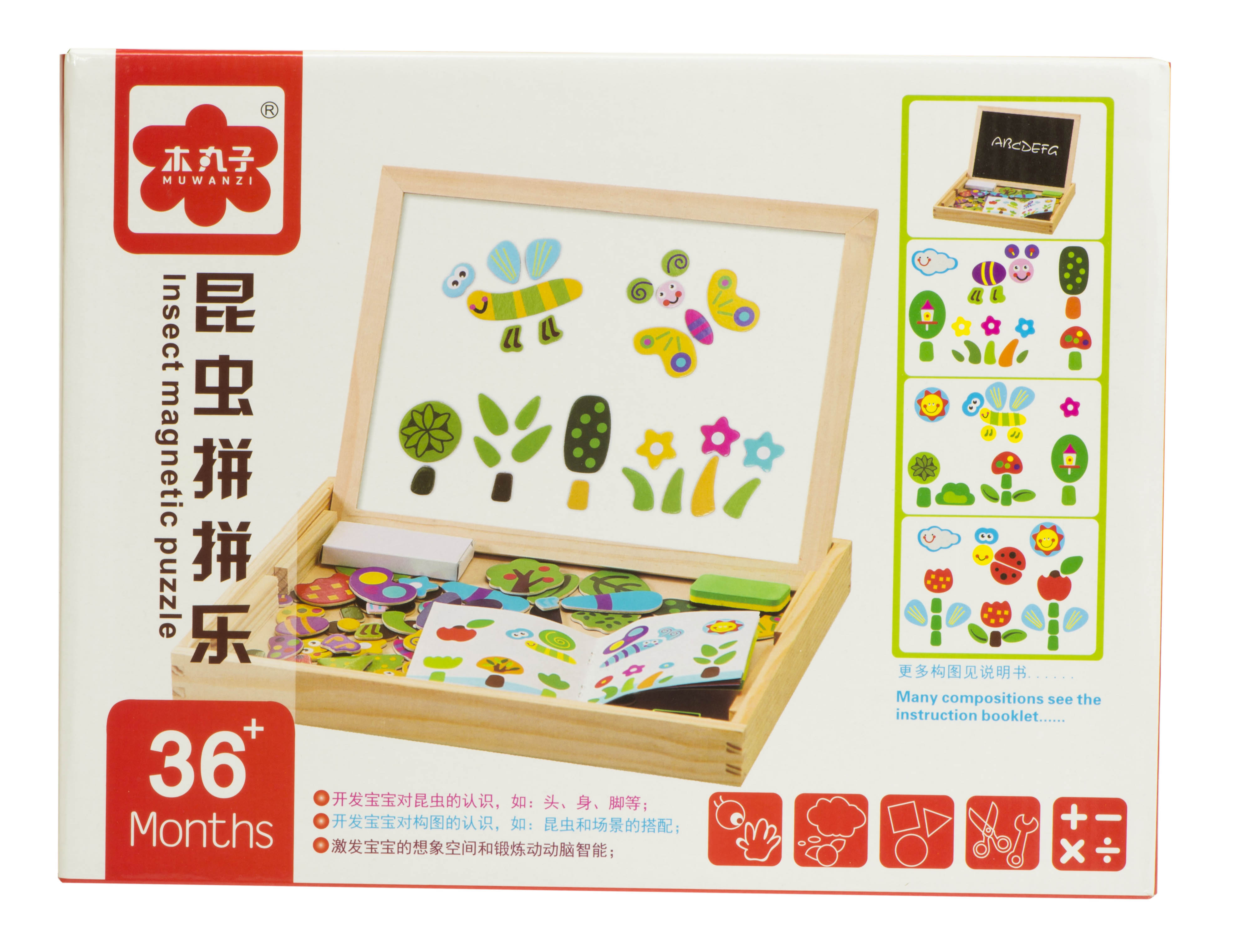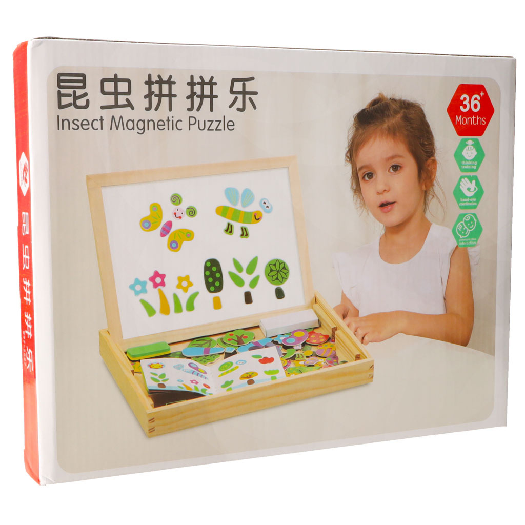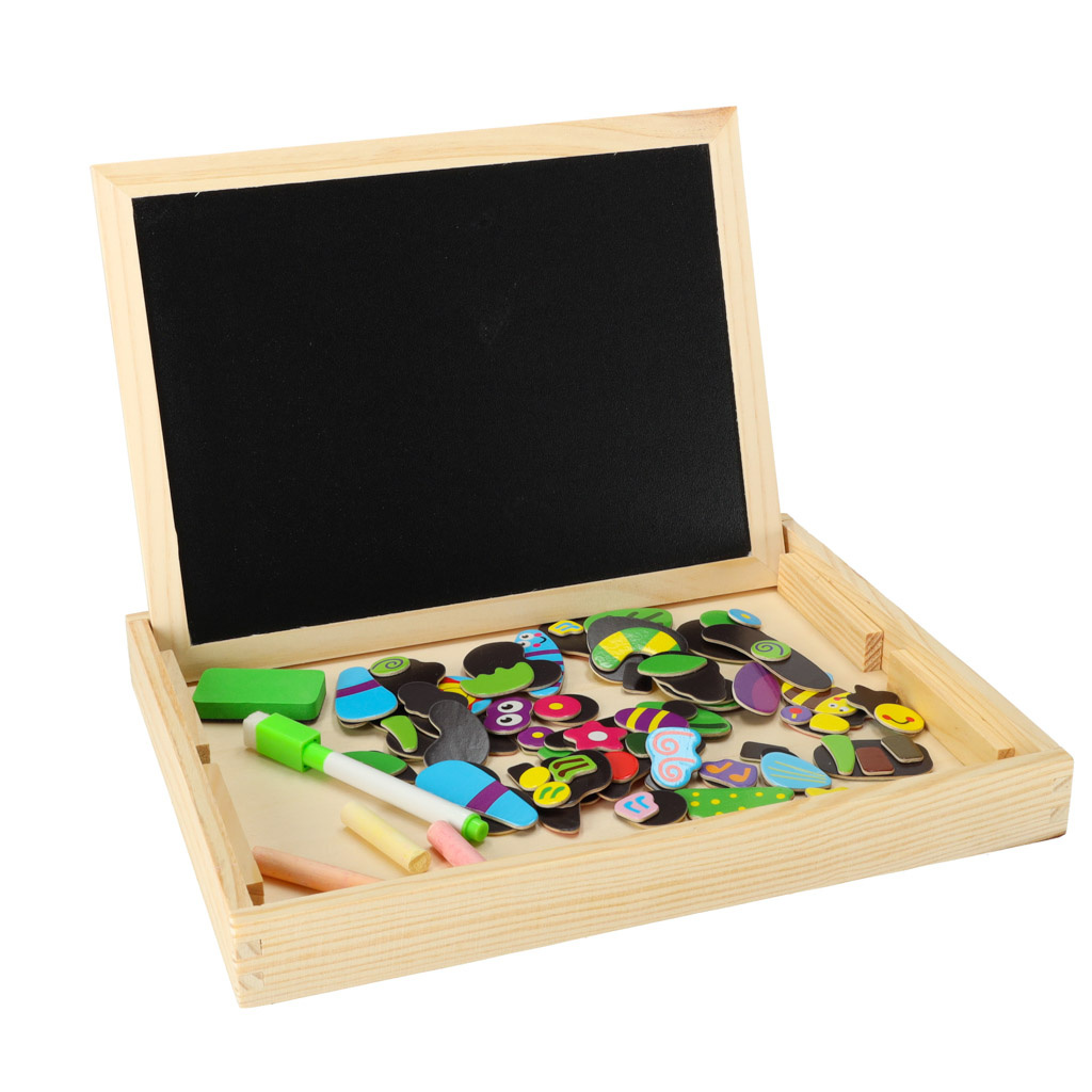 Oboustranná dřevěná deska s magnetickými skládačkami na uspořádání obrázků.