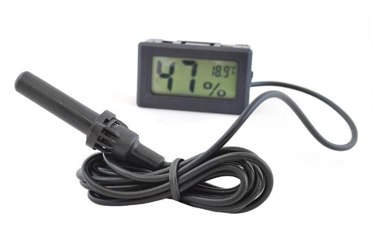 Elektronický vlhkoměr s teploměrem s velkým LCD displejem a sondou na dlouhém kabelu. Zařízení se vyznačuje dobrým rozlišením měření a rychlou odezvou. Stačí je nasadit na otevřenou ruku a téměř okamžitě uvidíte reakci nástroje. Sonda (senzor) může být umístěna kdekoli - v akváriu, teráriu, lednici, mrazáku, skleníku atd., všude tam, kde postačuje rozsah měření teploty od -50 stupňů C do 70 stupňů C.