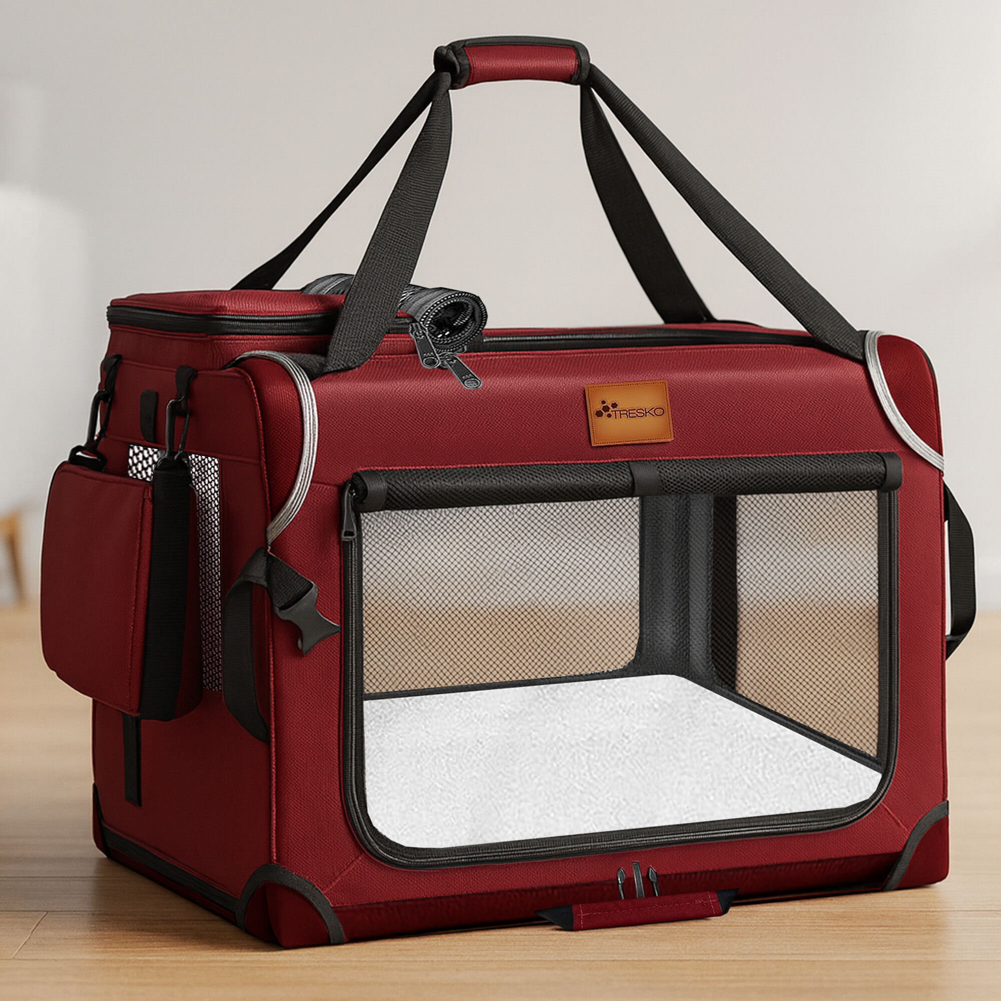 Dvě prostorné kapsy jsou ideální pro uskladnění pamlsků a hraček během výletů k veterináři nebo na dovolenou. Díky skládací ocelové konstrukci lze přepravku rychle složit a rozložit, což usnadňuje její uskladnění a šetří místo. Přepravka je vyrobena z odolného materiálu 600D Oxford, který je snadno udržovatelný.