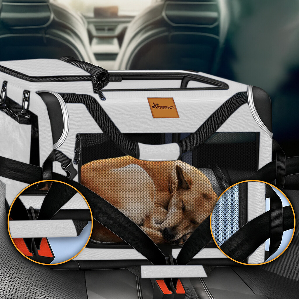 Dvě prostorné kapsy jsou ideální pro uskladnění pamlsků a hraček během výletů k veterináři nebo na dovolenou. Díky skládací ocelové konstrukci lze přepravku rychle složit a rozložit, což usnadňuje její uskladnění a šetří místo. Přepravka je vyrobena z odolného materiálu 600D Oxford, který je snadno udržovatelný.