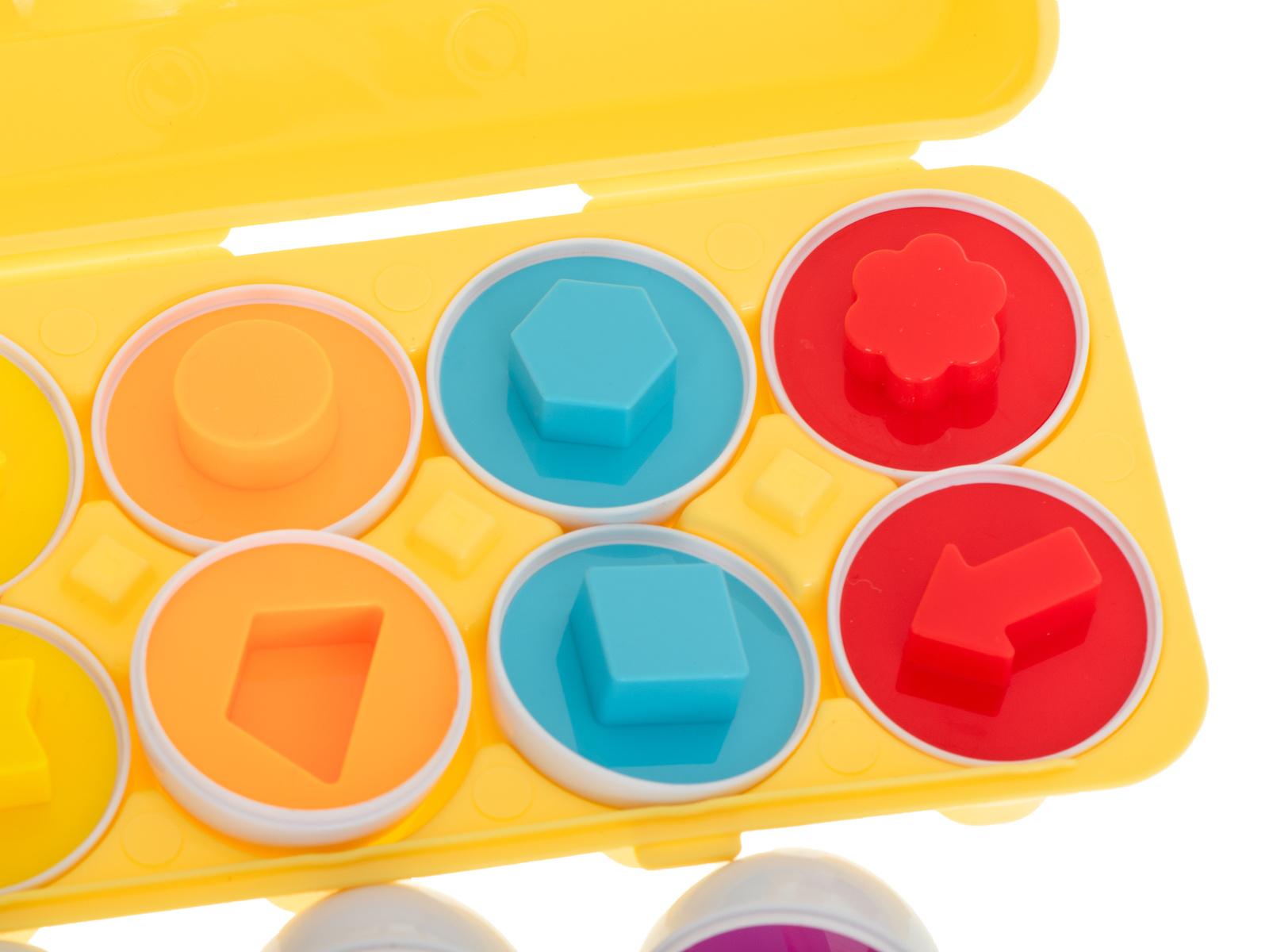 V sadě najdete 12 vajíček, která pod skořápkou skrývají různé tvary a barvy.