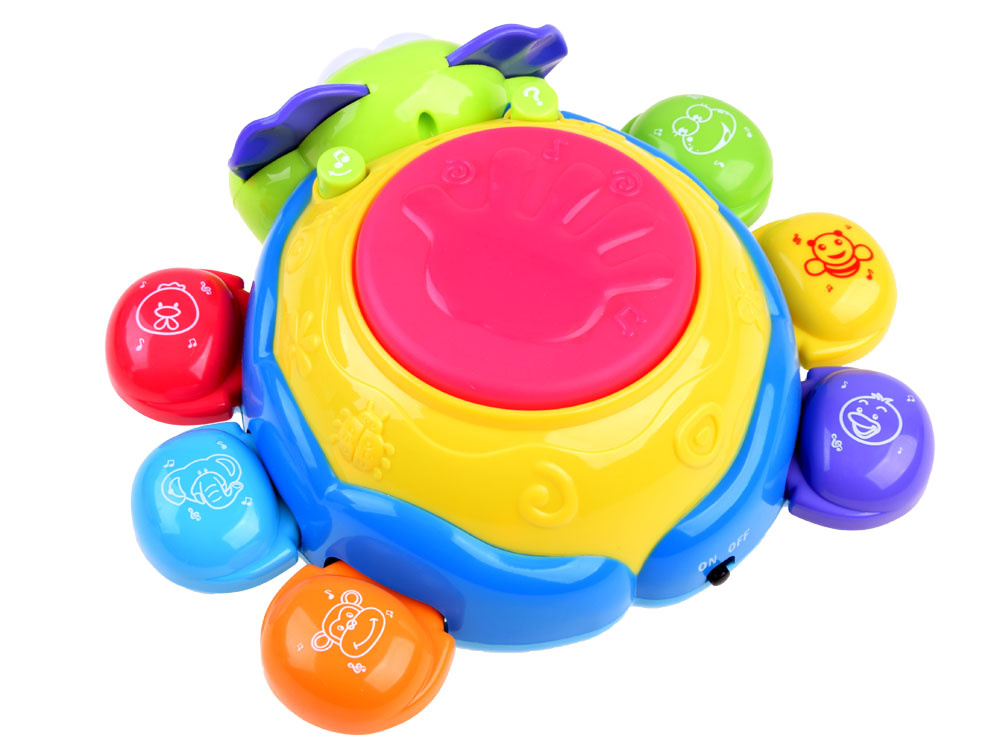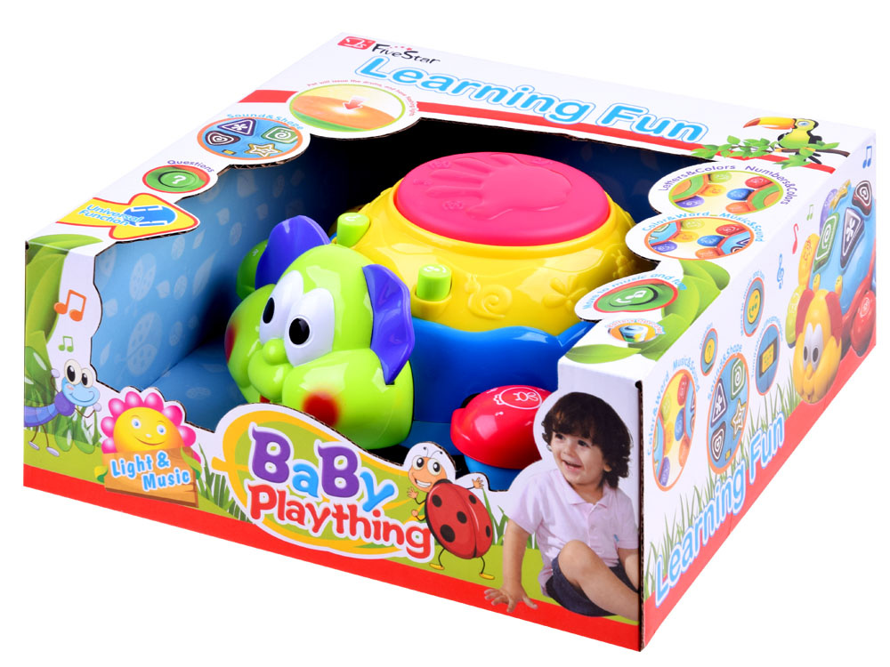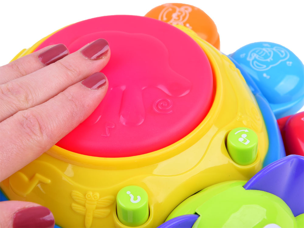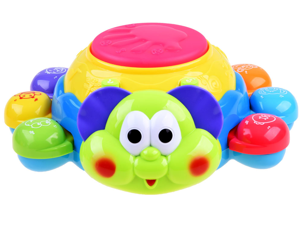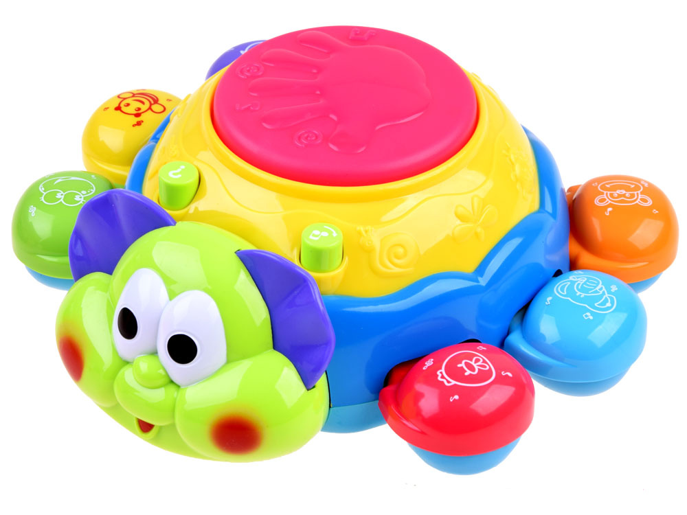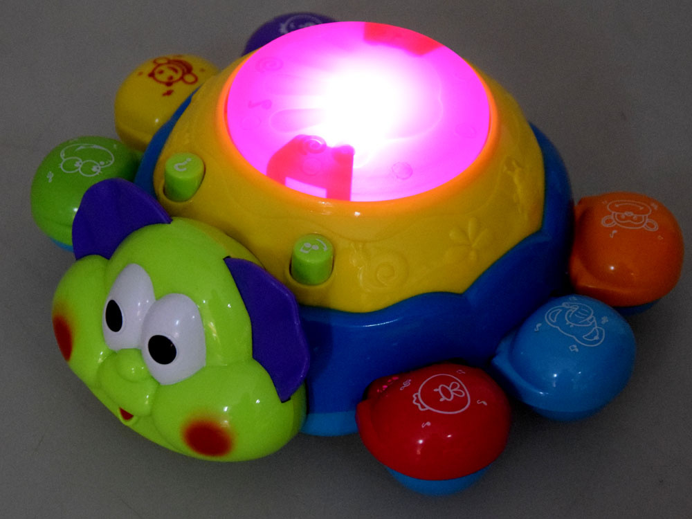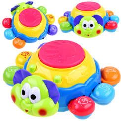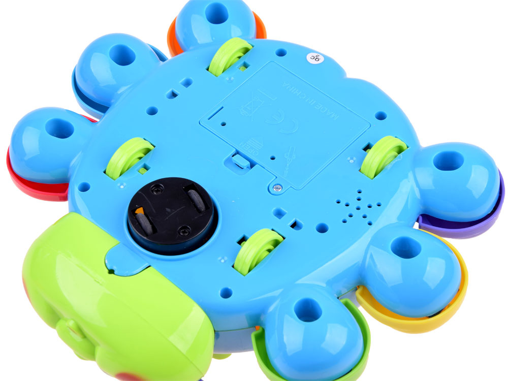 - hračka hraje melodie a jezdí (utíká), což pomáhá s učením plazení.