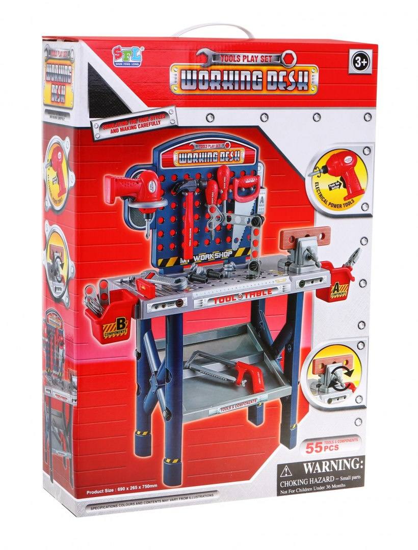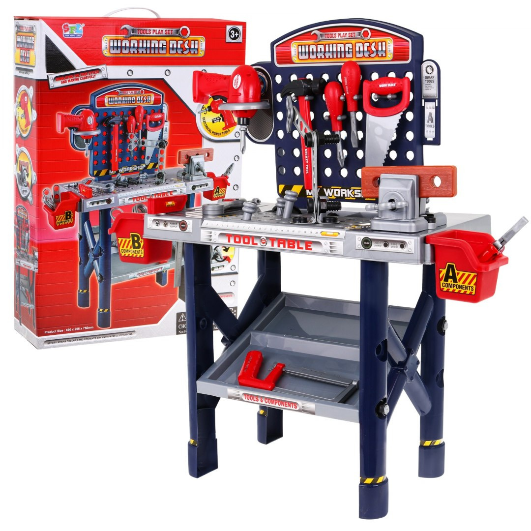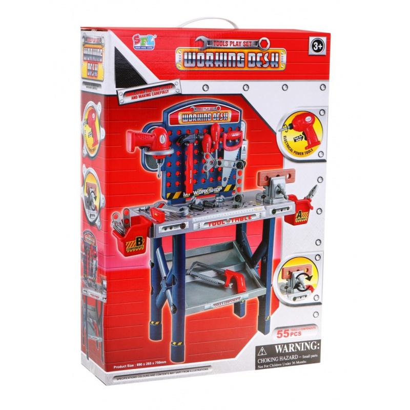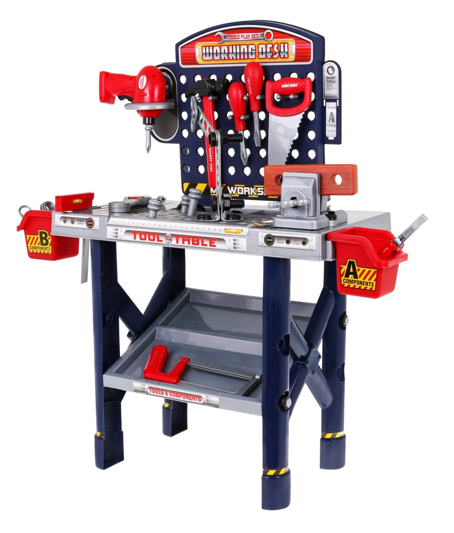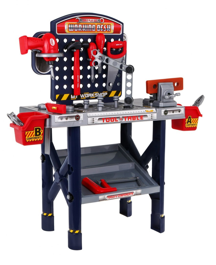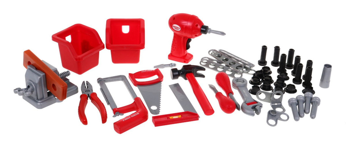 | - dílna, - svěrák, - šroubovák, - kladivo, - pila, - pilka na železo, - úhelník, - kleště, - 2 x šroubovák, - klíč, - výměnná krytka na šroubovák, - 4 x hmoždinka, - 8 x šroub, - 11 x matice, - šroubovák do dřeva, - 8 x obdélníkový kus na šroubování, - 2 x box na nářadí. | |