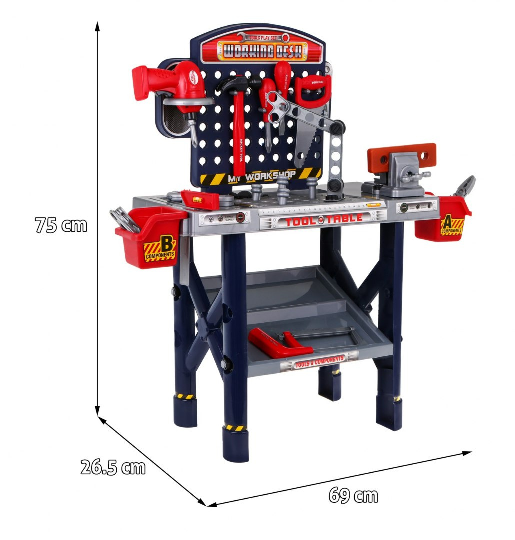 | - dílna cca. 69 cm x 26,5 cm x 75 cm, - šroubovák cca. 13 cm x 15,5 cm, - krabice na nářadí cca. 9,5 cm x 9,5 cm, - balení cca. 53 cm x 37 cm x 13 cm. |