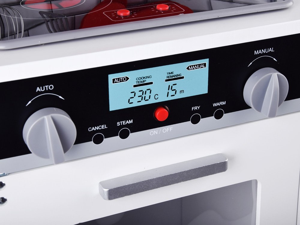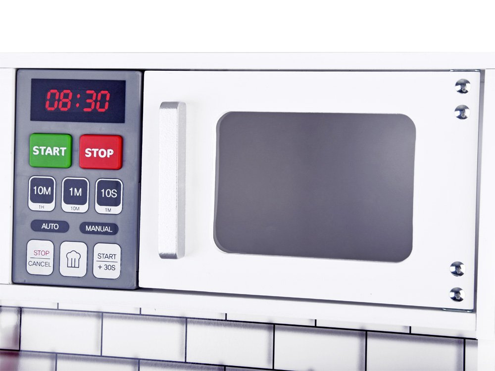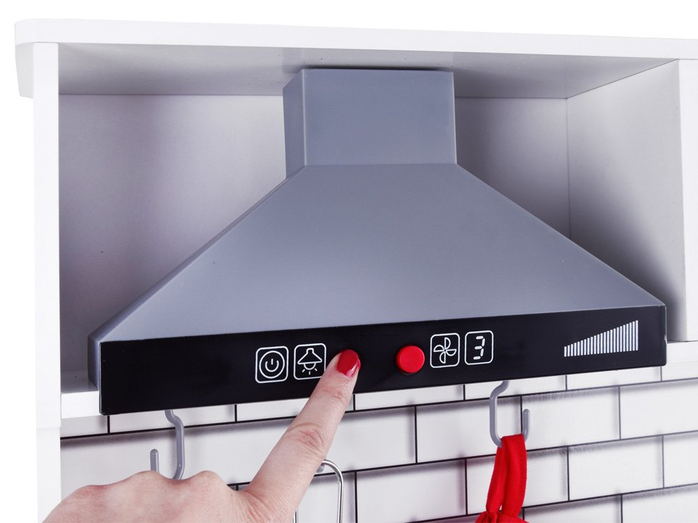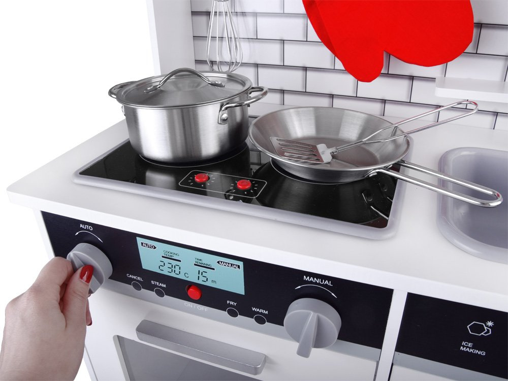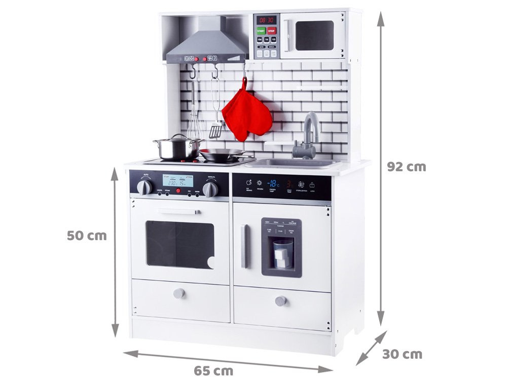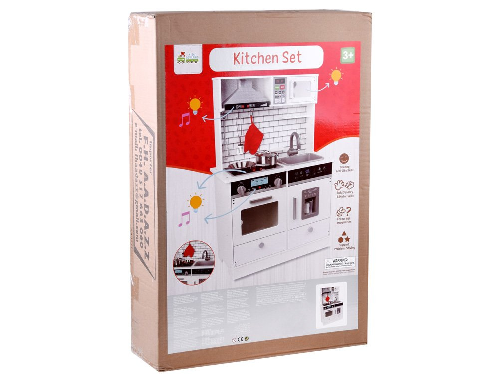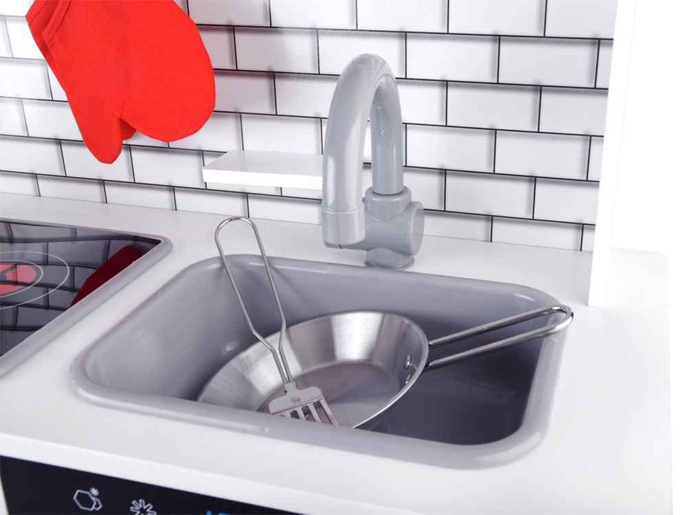 Velká dřevěná kuchyňka se světelnými a zvukovými efekty a doplňky pomalu přiměje každého malého kuchaře, aby uvařil své chutné jídlo. Souprava je velmi působivě vyrobena a je dodávána se všemi základními domácími spotřebiči. Nábytek z MDF, lakovaný bezpečnostní barvou ve vkusném skandinávském stylu. Bohatě zařízená kuchyňka v bílé barvě s módními cihlami se skvěle hodí do každého dětského pokoje, kuchyňského koutu.