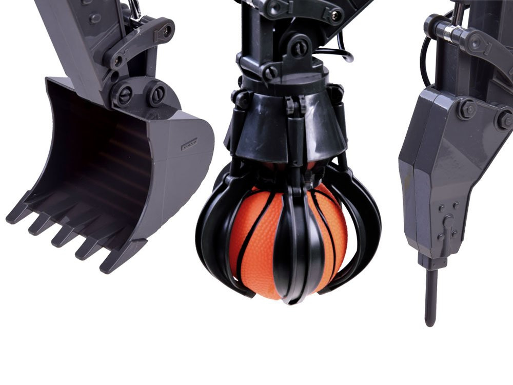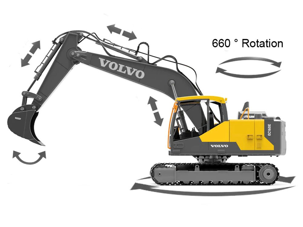 Velké dálkově ovládané rypadlo s vyměnitelným příslušenstvím zvládne mnoho stavebních prací. Bagr od společnosti EE velmi pečlivě a precizně vyrobený. Má plný pracovní záběr, kabina se otáčí o 660°, lžíce pracuje nahoru, dolů, doprava, doleva.