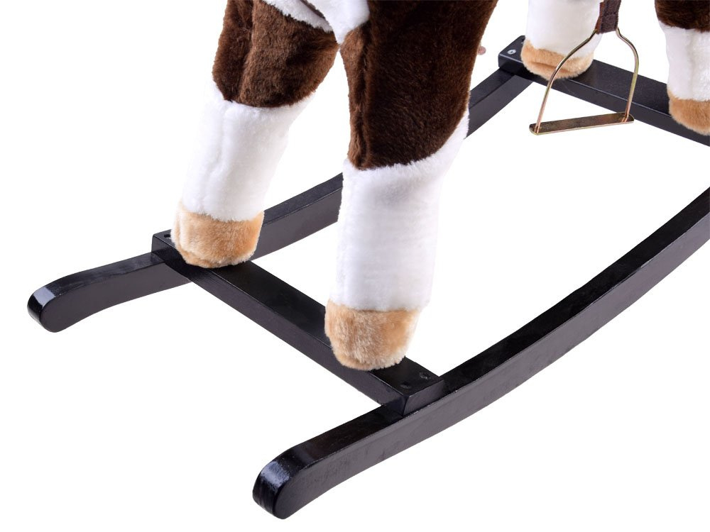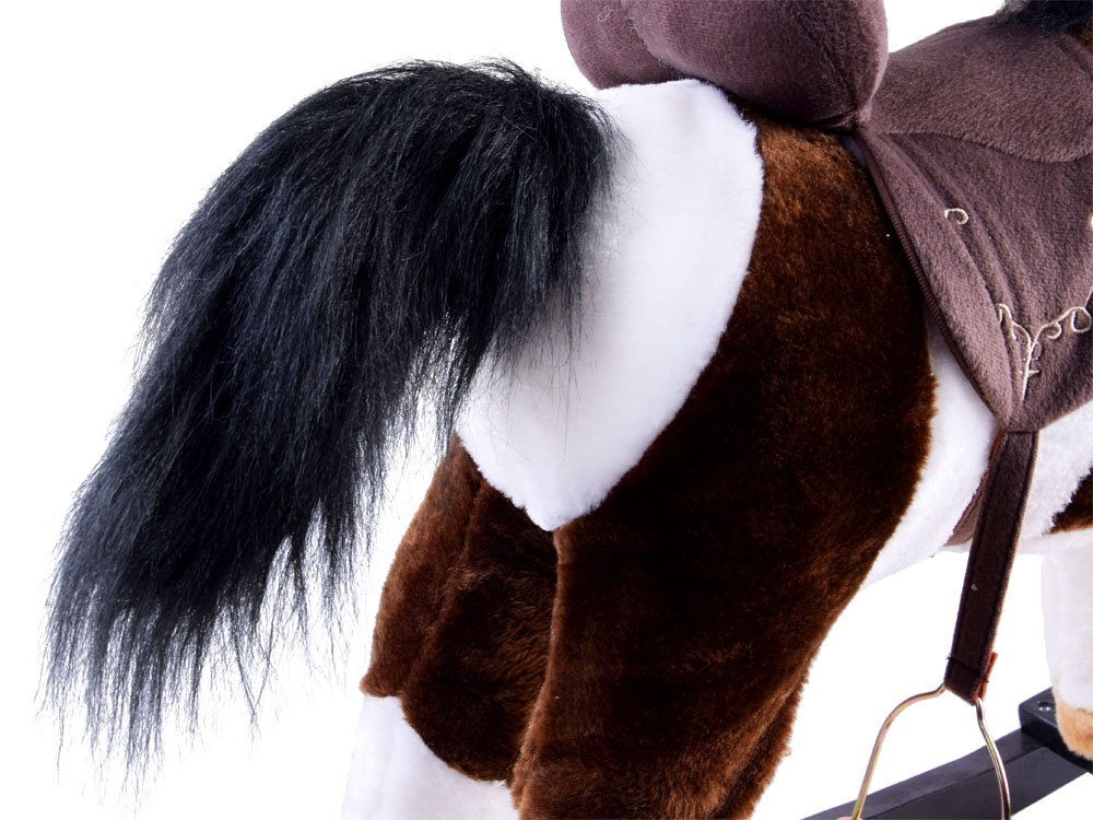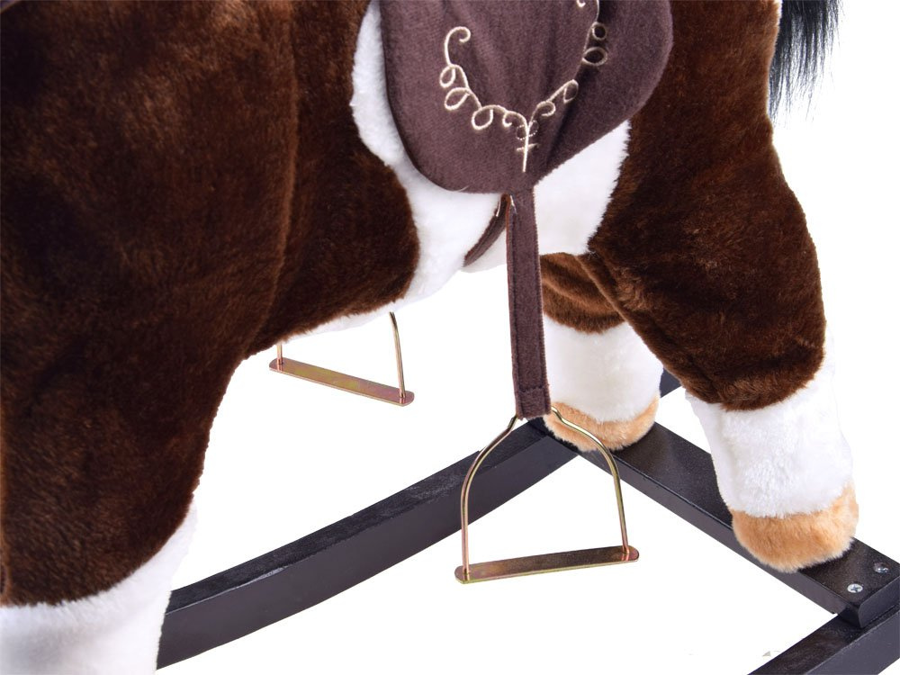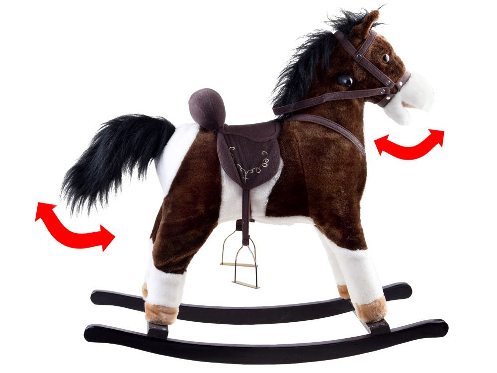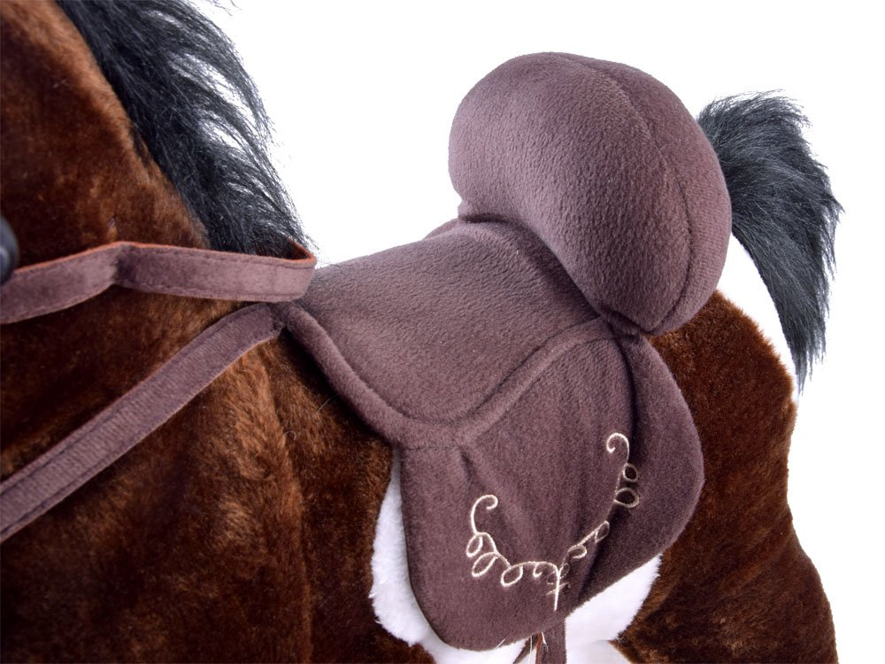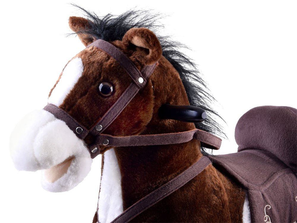 Na pravém a levém uchu koně jsou tlačítka, která po dotyku spustí zvuk řehtání, cválání, kůň začne pohybovat tlamou a vrtět ocasem. Kůň je vyroben z měkkého plyše. Má dřevěné rukojeti, otěže a tvarované sedlo se třmeny.