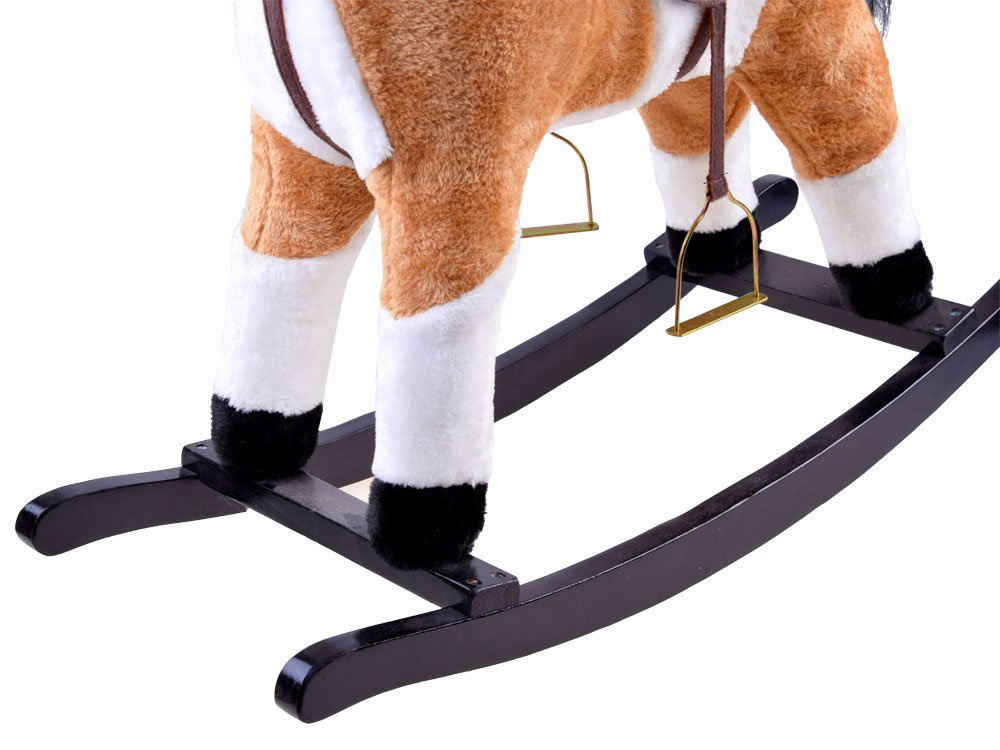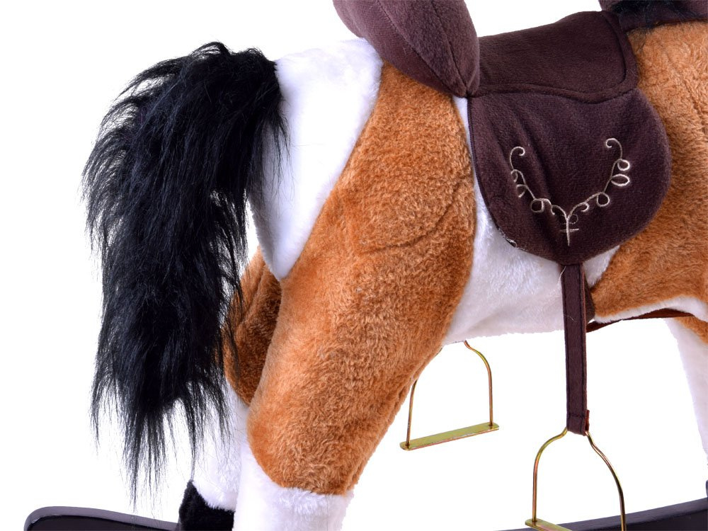 Na pravém a levém uchu koně jsou tlačítka, která po dotyku spustí zvuk řehtání, cválání, kůň začne pohybovat tlamou a vrtět ocasem. Kůň je vyroben z měkkého plyše. Má dřevěné rukojeti, otěže a tvarované sedlo se třmeny.