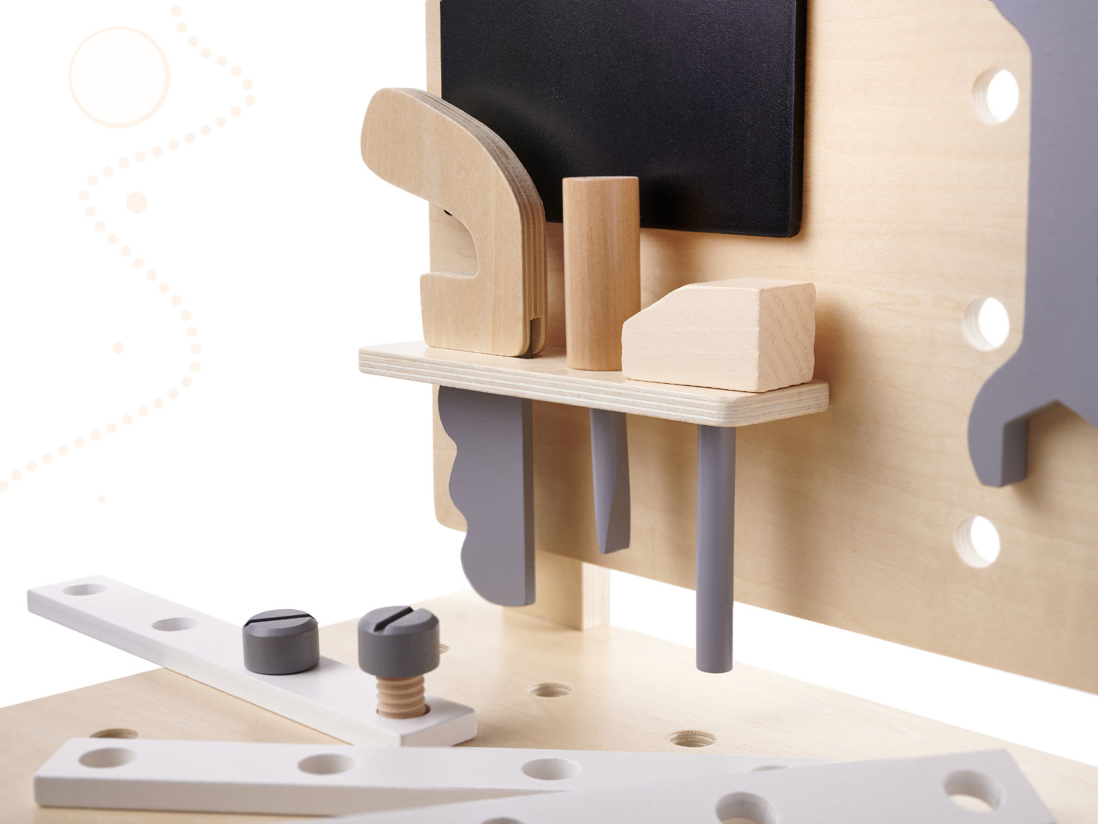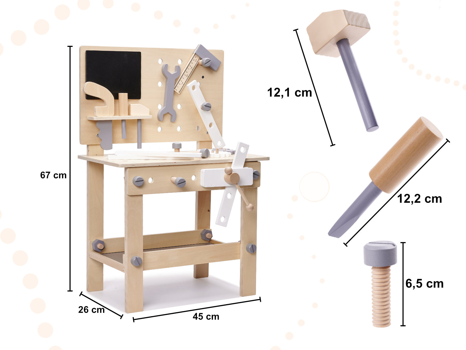 Senzační workshop s nástroji. Splněný sen malého kutila. Podporuje logické myšlení a stimuluje kreativitu. Obsahuje: stůl, pilu, šroubovák, 11 šroubů, 6 krytek, svěrák, klíč, převody, metr, kladivo. Rozměry.45x26x67 cm.Celý popis