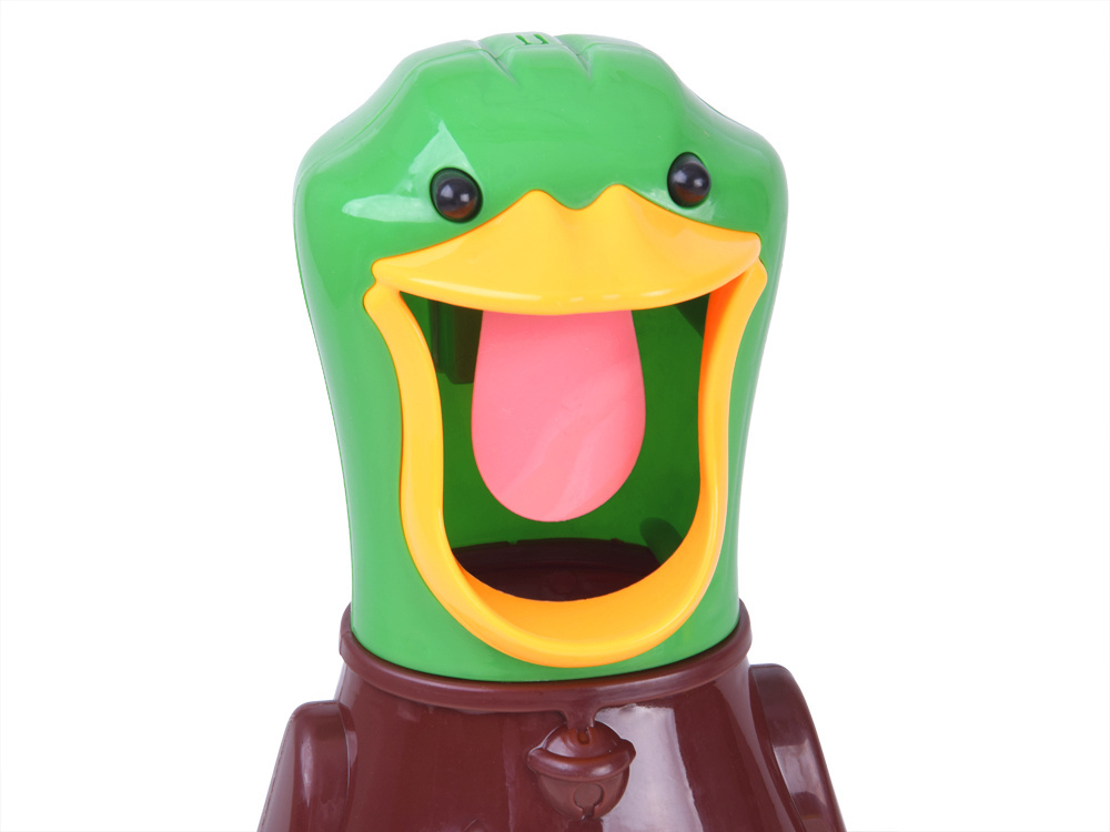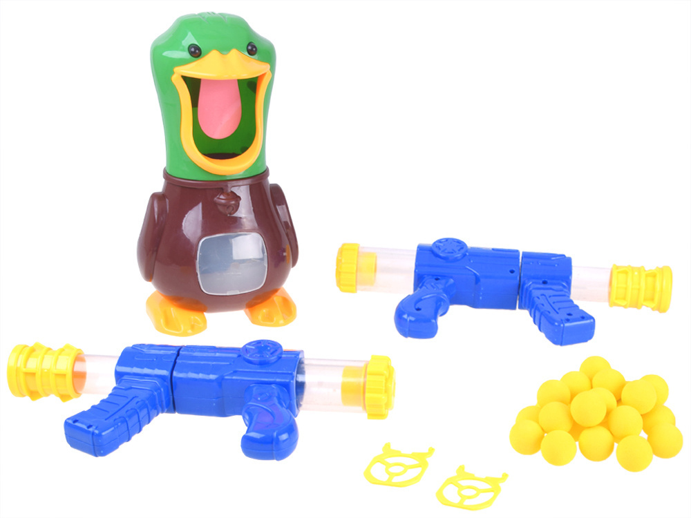 Sada obsahuje: - kachnu s otevřeným zobákem a pohyblivým jazykem - dvě pumpovací pistole - 2 x terč - 24 pěnových míčků