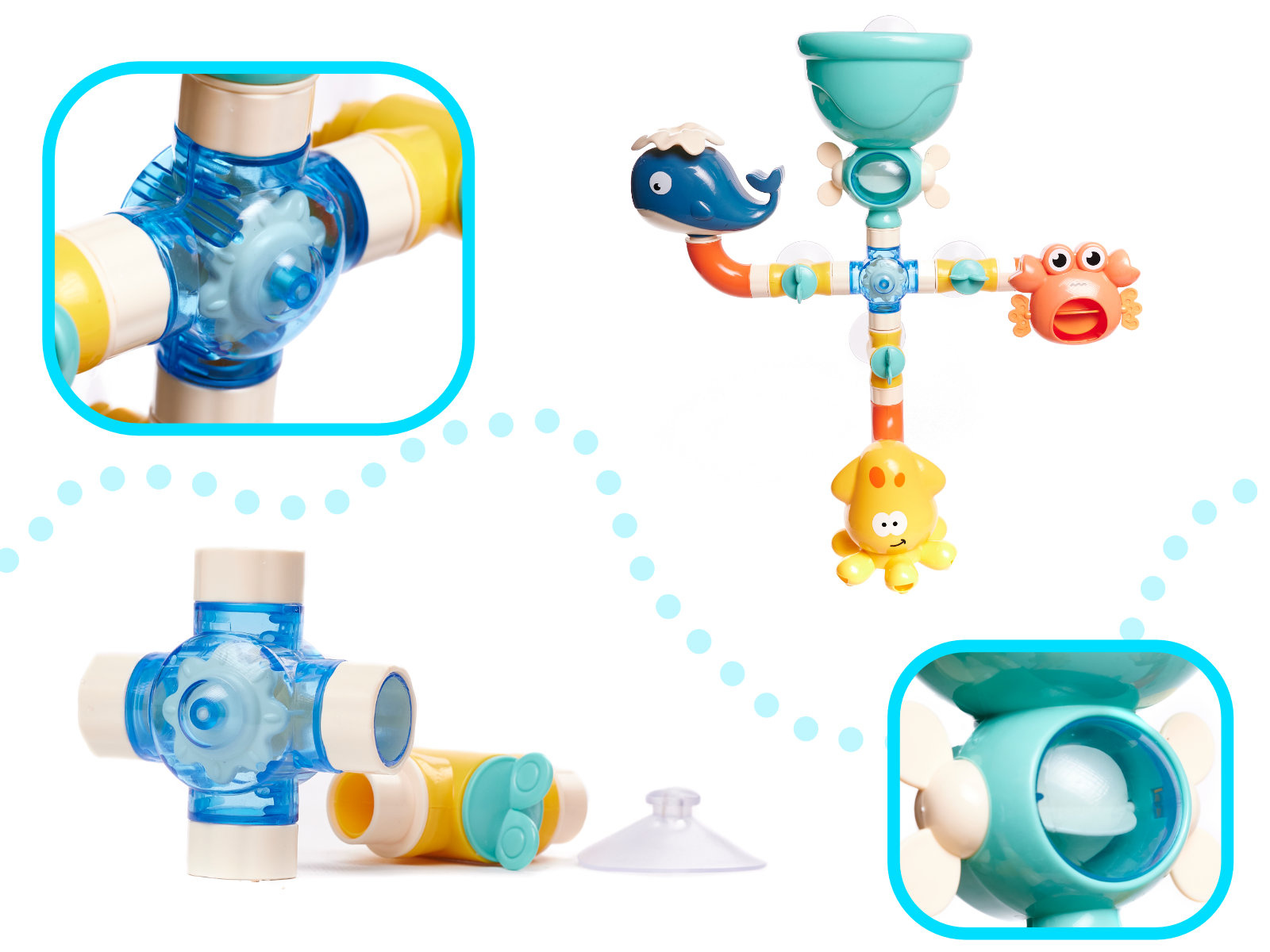 Poté pomocí hrnku nebo sprchy nalijte vodu, která proudící systémem propojených trubek aktivuje jednotlivé mořské živočichy.