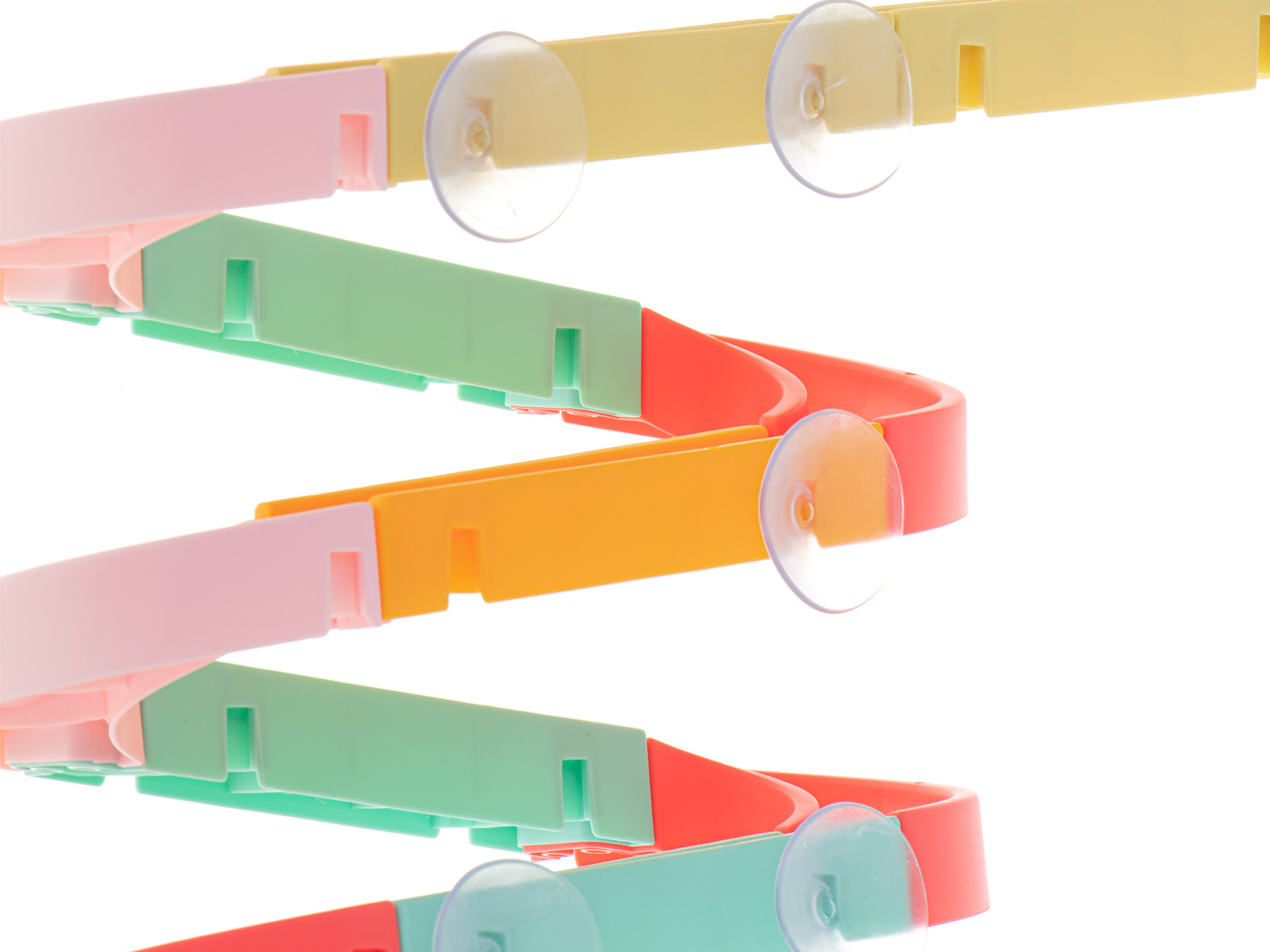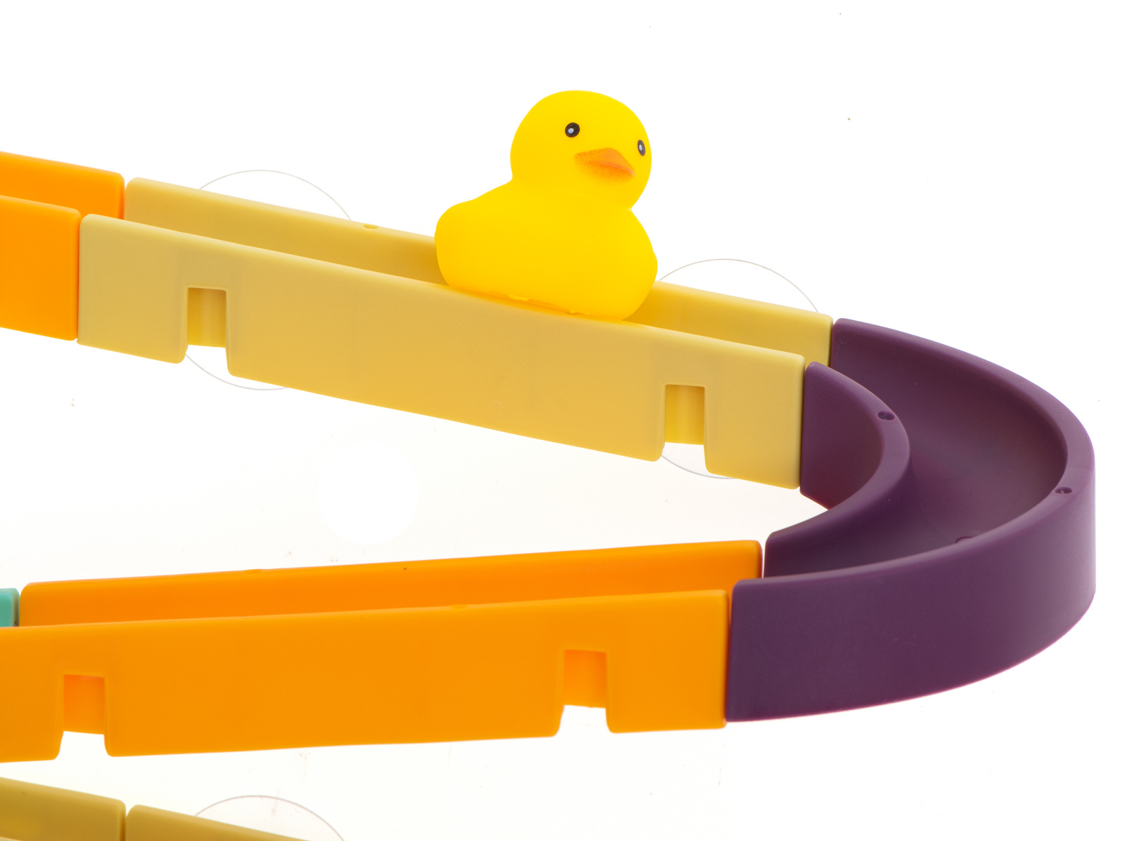 Součástí hračky jsou přísavky, které usnadňují připevnění dráhy k obkladu nebo vaně.