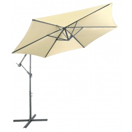 Praktický zahradní slunečník vyrobený z odolného polyesteru, jehož noha je umístěna mimo stíněnou plochu.
