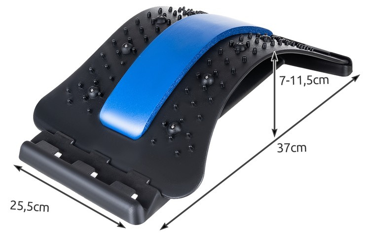 SPECIFIKACE -materiál: ABS a PP pěna; akupresurní masážní hroty: Ano; pohodlný pěnový popruh: Ano; tři úrovně nastavení: Ano; možnost použití v sedě i vleže: Ano; maximální zatížení: 150 kg; rozměry (výška/šířka/hloubka): 7-11,5/25,5/37cm; hmotnost: 0,53 kg; hmotnost v balení: 0,64 kg